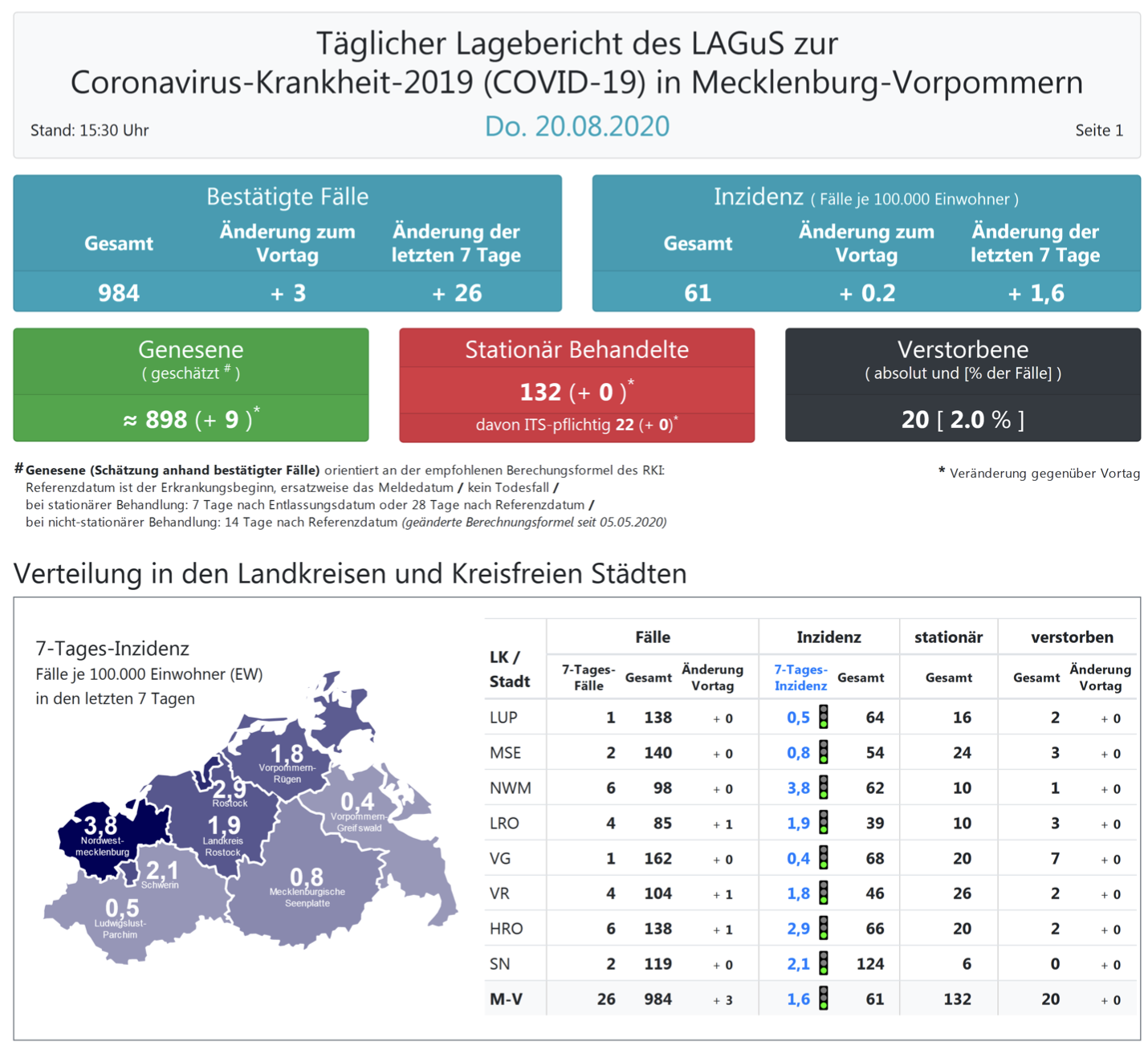 Landesweit müssen oder mussten den Angaben zufolge 132 (+0) Menschen in Kliniken behandelt werden, 22 (+0) von ihnen auf Intensivstationen.