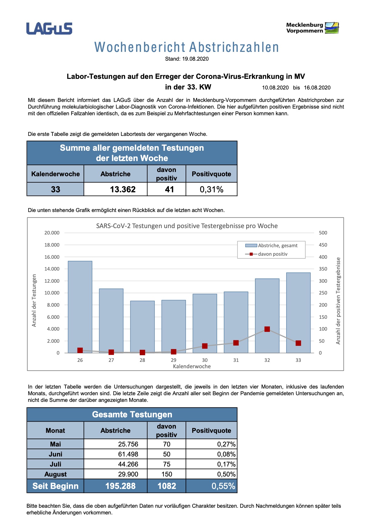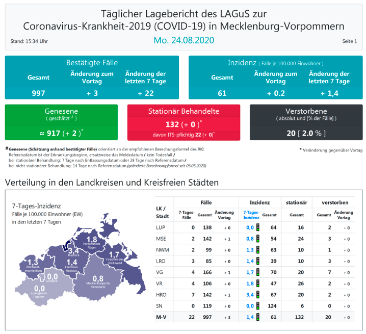 Laut einer Schätzung des Robert Koch-Instituts (RKI) sind in Mecklenburg-Vorpommern 917 (+2) der positiv getesteten Menschen von einer Covid-19-Erkrankung genesen. Insgesamt gab es bislang 20 Todesfälle im Land. Landesweit müssen oder mussten den Angaben zufolge 132 (+0) Menschen in Kliniken behandelt werden, 22 (+0) von ihnen auf Intensivstationen.