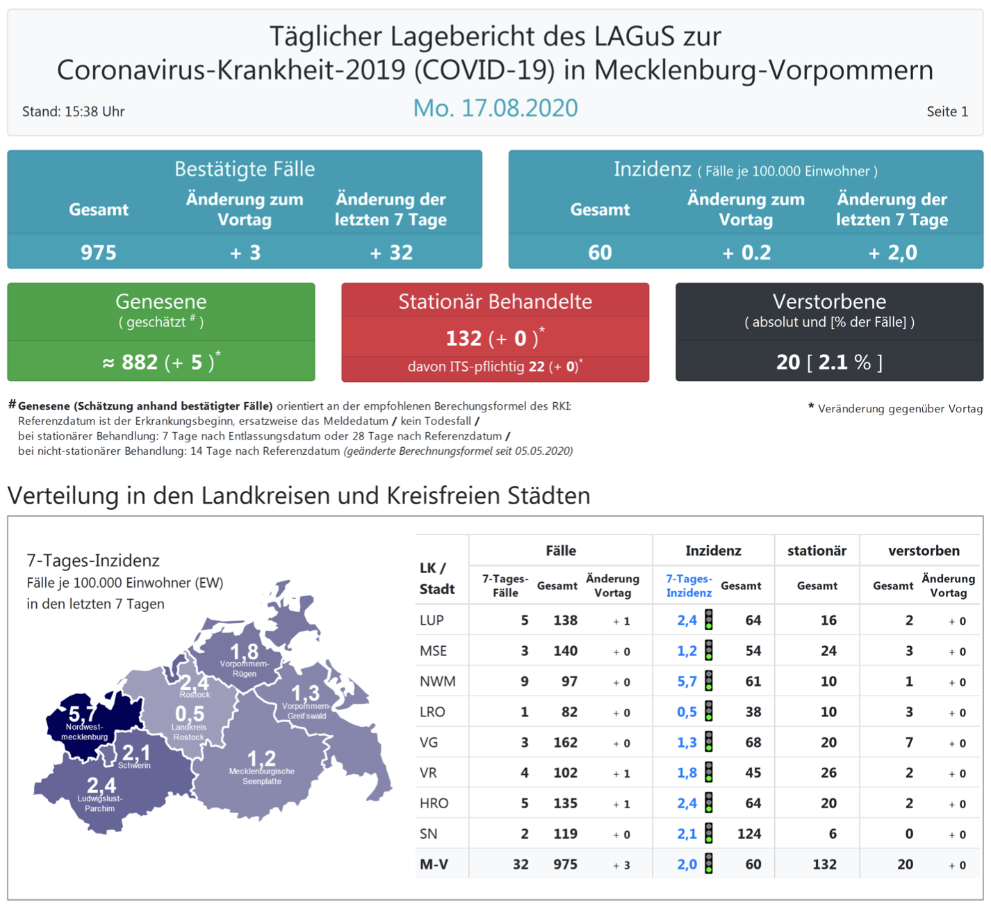 Laut einer Schätzung des Robert Koch-Instituts (RKI) sind in Mecklenburg-Vorpommern 882 (+5) der positiv getesteten Menschen von einer Covid-19-Erkrankung genesen. Insgesamt gab es bislang 20 Todesfälle im Land.