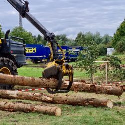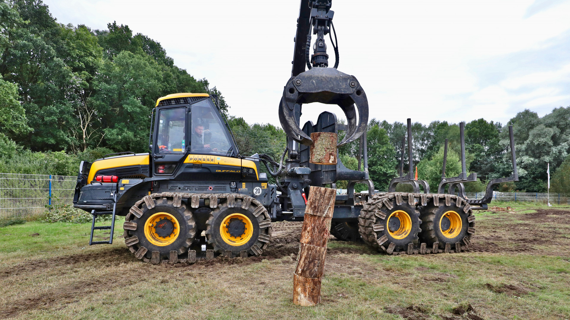 Dabei hatten die Männer an den Joysticks der PS-Riesen zwei komplizierte Aufgaben zu lösen: Sie mussten mit ihren Greifern möglichst schnell und hoch fünf Holzklötze aufstapeln sowie mehrere Stämme auf einem Parcour bergen und einlagern. Für Fehler gab es jeweils 30 Sekunden Strafzeit.