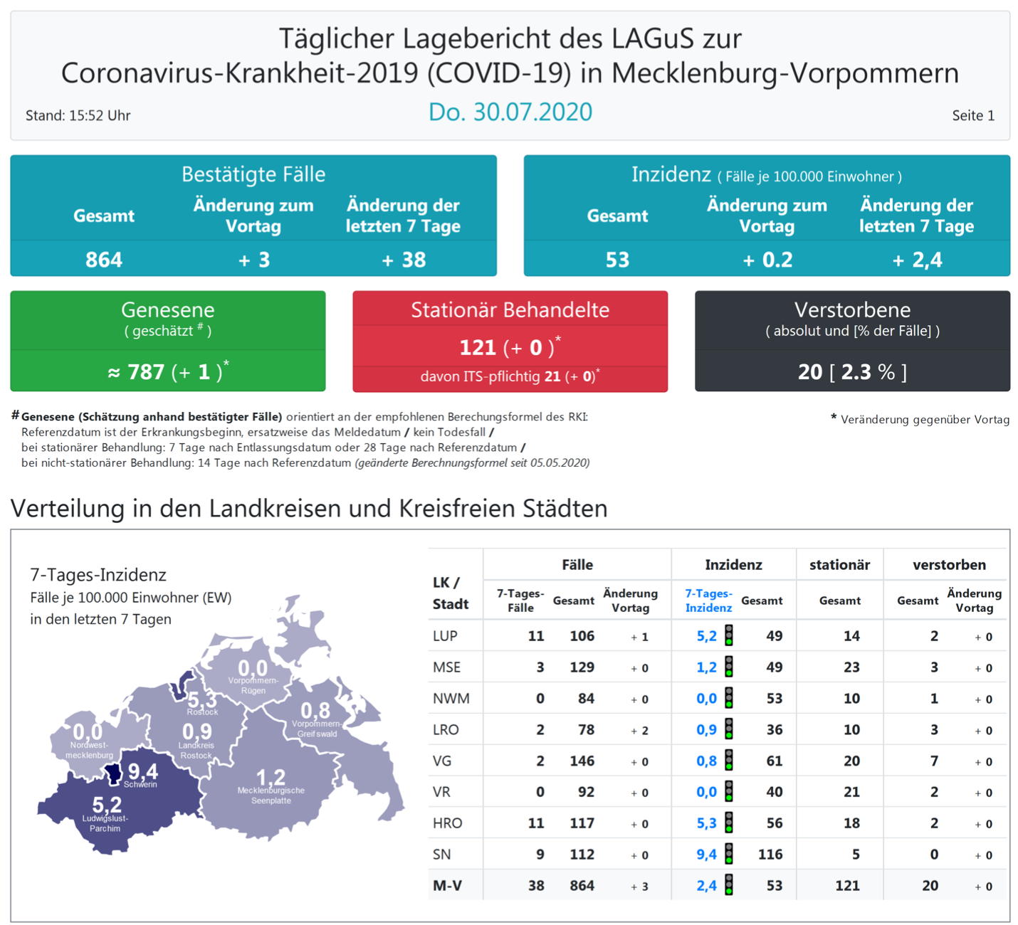 Laut einer Schätzung des Robert Koch-Instituts (RKI) sind in Mecklenburg-Vorpommern 787 Personen der positiv getesteten Menschen von einer Covid-19-Erkrankung genesen. Insgesamt gab es bislang 20 Todesfälle im Land. Landesweit müssen oder mussten den Angaben zufolge 121 Menschen in Kliniken behandelt werden – 21 von ihnen auf Intensivstationen.