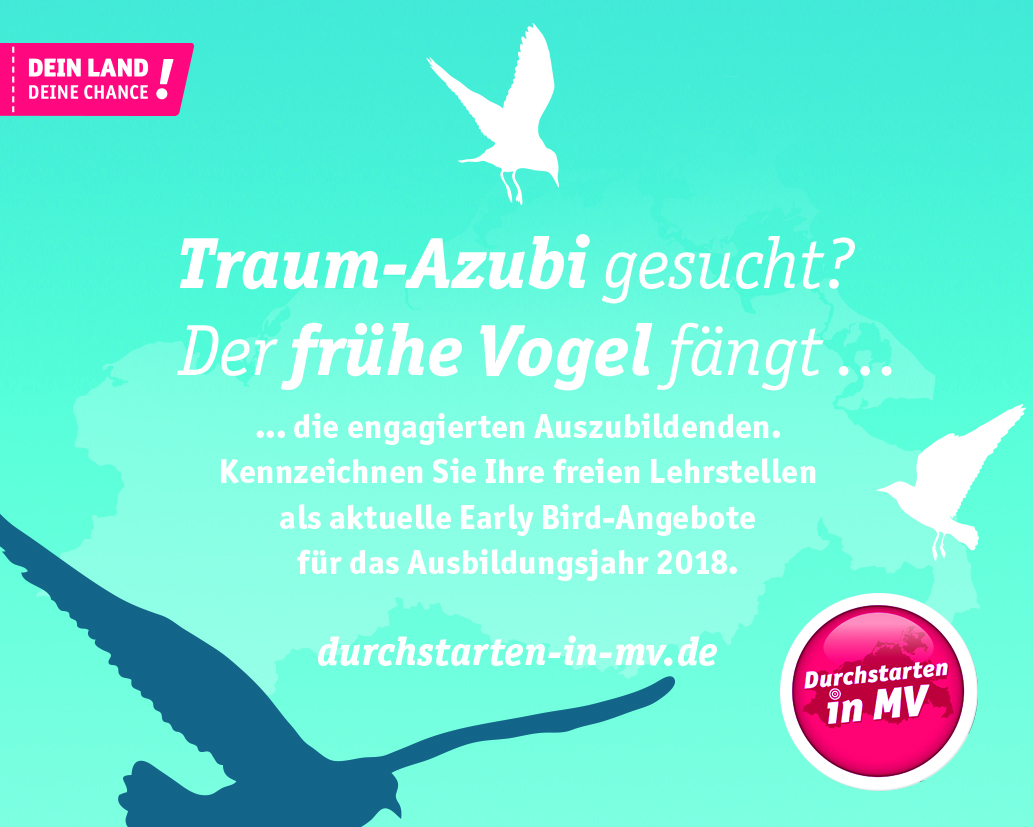 Die Landesfachkräftekampagne „Durchstarten in MV“ (www.durchstarten-in-mv.de) ist mit der Early Bird-Aktion gestartet. „Die Aktion wendet sich an Jugendliche, die noch einen Ausbildungsplatz suchen und gleichermaßen an Unternehmen, die Auszubildende suchen. Wir werben damit noch intensiver für eine berufliche Karriere im eigenen Land. Diese beginnt mit einem Ausbildungsplatz in Mecklenburg-Vorpommern“, sagte der Minister für Wirtschaft, Arbeit und Gesundheit Harry Glawe.