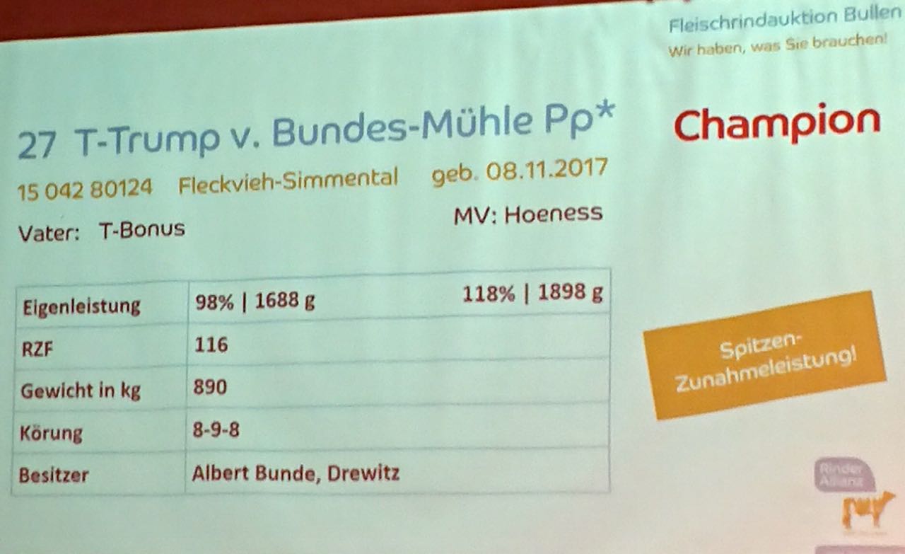 Das Ergebnis kann sich sehen lassen: Innerhalb von zweieinhalb Stunden sind alle 52 Bullen verkauft, die ihren guten Fleisch- und Gesundheitsgene und die ihrer Vorfahren weitergeben sollen. Ausgangswert sind immer 2000 Euro. Bei «T-Trump“ geht es auf 4000 Euro, auch bei vielen anderen. Der Durchschnittspreis sind im Endeffekt knapp 3300 Euro, die höchsten Preise erzielen drei Tiere der Rasse Angus, wie sie auch in und um Karow zu sehen sind: Sie erzielen jeweils 5300 Euro.
