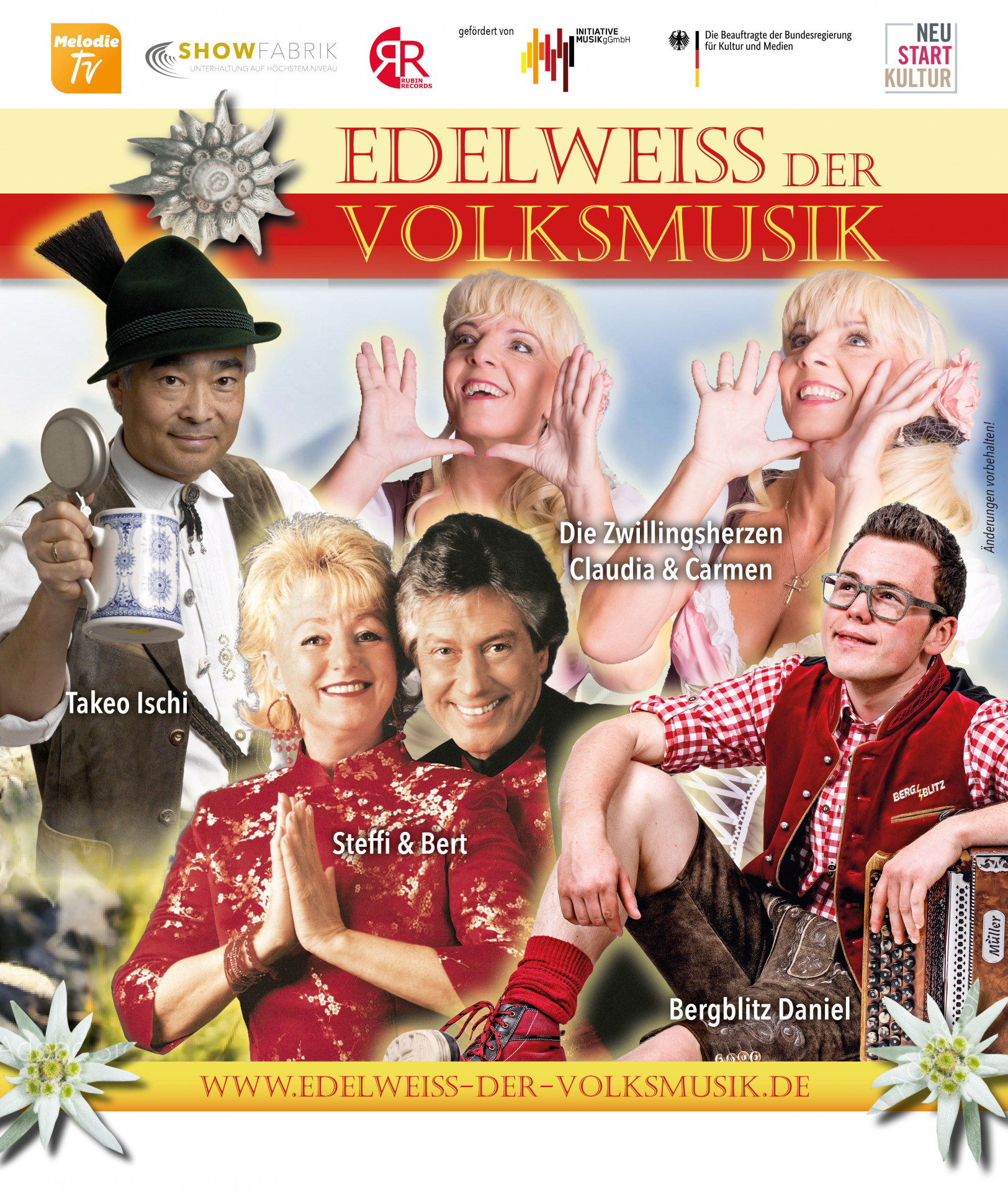 Ergänzt wird das Ganze mit den artistischen Höchstleistungen der charmanten Gastgeberinnen und den unnachahmlichen Parodien der beiden Berliner Urgesteine Steffi & Bert, der ansteckenden Heiterkeit, die Bergblitz Daniel auf seiner „Steirischen“ verbreitet, sowie mit einem echten Jodelkurs vom japanischen Meisterjodler Takeo Ischi.