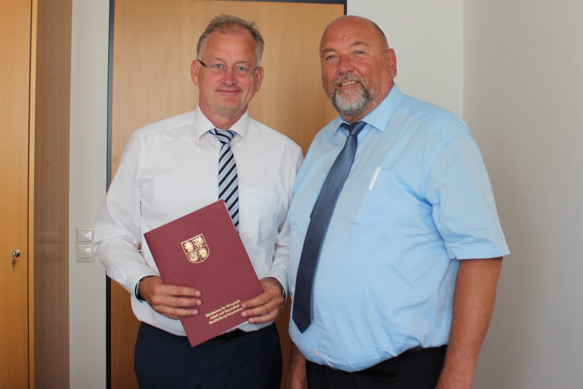Foto unten: Minister Glawe (r.) und Landrat Kärger bei der Übergabe des Förderbescheids in der Neubrandenburger Kreisverwaltung