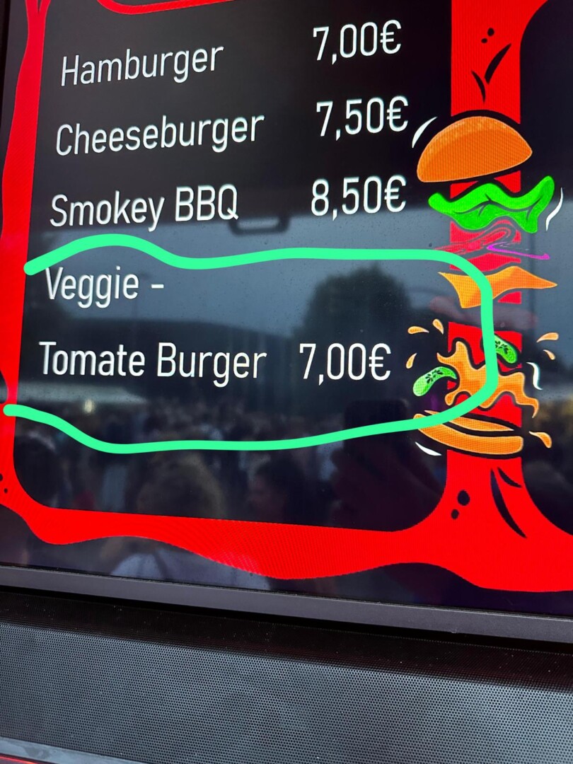 Ich bestellte einen „Veggie – Tomate Burger“ für 7€. Er kostete das Gleiche wie der Hamburger mit Fleisch. Als ich den Burger erhielt, war ich verwundert und dachte erst, dass sie das Burger-Patty vergessen hatten. Es stellte sich aber heraus, dass der Veggieburger lediglich aus Tomate, Salat und Soße bestand. Ich war sehr verwundert darüber, dass ein Burger mit Fleisch-Patty das gleiche kostet wie ohne.