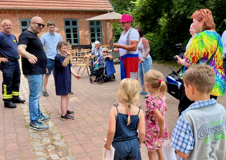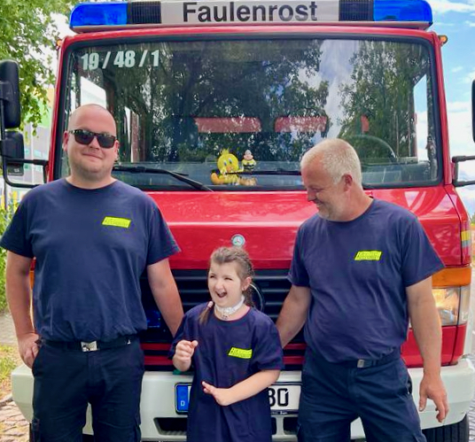 Als Luna im Feuerwehrauto der Faulenroster Wehr mit Blaulicht und Martinshorn in das Dorf einfuhr, standen Menschen mit Fähnchen am Straßenrand, um sie am Pfarrhof zu begrüßen. Dort erwartete Luna eine weitere Überraschung: Die Feuerwehr Waren hatten ihre Drehleiter bereitgestellt. Luna, die Feuerwehren liebt und sogar zu Hause in einem Feuerwehrbett schläft, war begeistert.