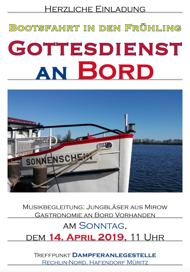 Am kommenden Sonntag, 14. April, startet um 11 Uhr das Fahrgastschiff „Sonnenschein“ von Rechlin aus auf die Müritz, und an Bord gibt es einen Gottesdienst. Musikalisch begleitet wird der Gottesdienst von den Jungbläsern aus Mirow. Der Eintritt ist frei, Gastronomieangebot an Bord ist vorhanden.