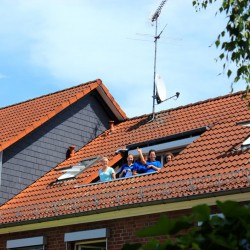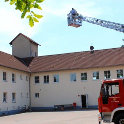 Auf dem Feuerwehrhof wurde inzwischen die Drehleiter in Stellung gebracht. Wehrleiter Harald Hakert und sein Stellvertreter Reimond Kamrath „opferten“ ihre Mittagspause, um dabei sein zu können, und René Dreier bediente an seinem freien Tag das Rettungsfahrzeug.