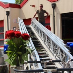 Und dann tauchte sie auf: Die Herzdame von Hannes. Völlig verdutzt, weil ihre Eltern am Gerätehaus standen und auch gleich ziemlich aufgelöst. Dennoch stieg sie bereitwillig in den Drehleiterkorb und fuhr mit ihrem Lebensgefährten in luftige Höhe. Oben angekommen, stellte er ihr dann die alles entscheidende Frage und steckte ihr einen Ring auf den Finger. Was er gefragt und sie geantwortet hat, konnten die Untenstehenden nur erahnen, aber Hannes gab voller Freude ein OK-Zeichen.