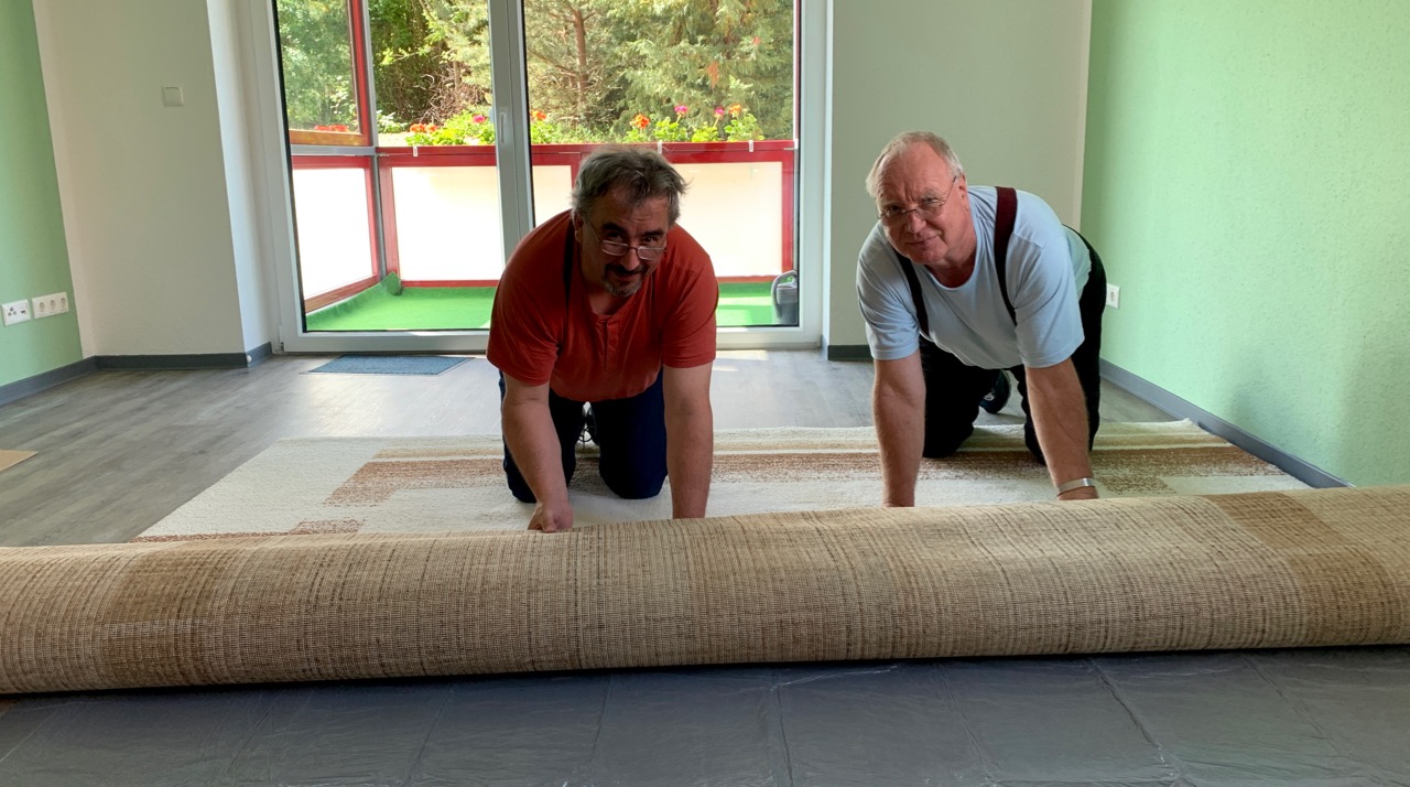 Foto unten: Kurt Barczynski (rechts) und sein Helfer Hartmut beim Einrichten der neuen Wohnung.