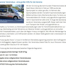 Der Vereinsbus, ein Opel Vivario, ist vor einigen Jahren im Zuge eines Sportprojektes angeschafft worden. Er soll Vereinen zum Transport der Kinder- und Jugendlichen zu Wettkämpfen, zu Turnieren, zu Sportveranstaltungen oder für Ferienfahrten zur Verfügung stehen. So steht’s jedenfalls auf der Homepage der Stadt unter der Überschrift: „Der Warener Vereinsbus – eine große Hilfe für die Vereine“.