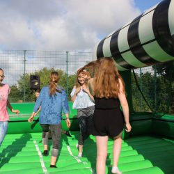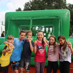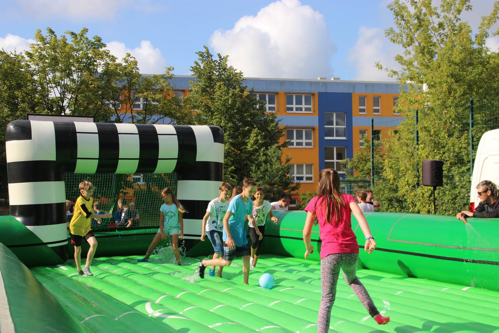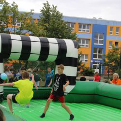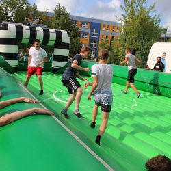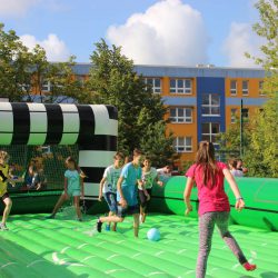Die Watersoccer- Anlage sorgte in dieser Woche für viel Spaß an der Schule. Die Mädchen und Jungen nutzen die Möglichkeit, auf einem XXXL-Luftkissen-Wasserfußballfeld den Ball ins Tor zu bringen.