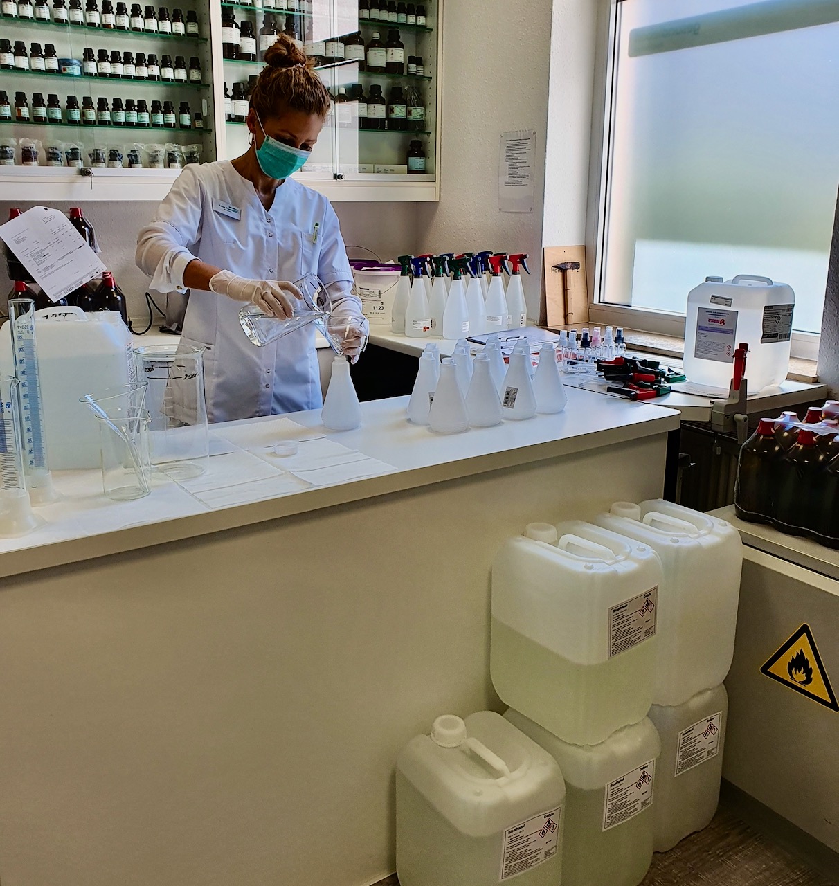 Und sie mussten schnell lernen. Denn das Herstellen von Desinfektionsmitteln zählt normalerweise nicht zum Alltag von Apothekern. „In meinen 24 Jahren als selbstständige Apothekerin gab es so etwas noch nicht, aber der Mensch wächst ja mit seinen Aufgaben, und so hatten wir den Dreh schnell ‚raus“, berichtet Heike Daut.