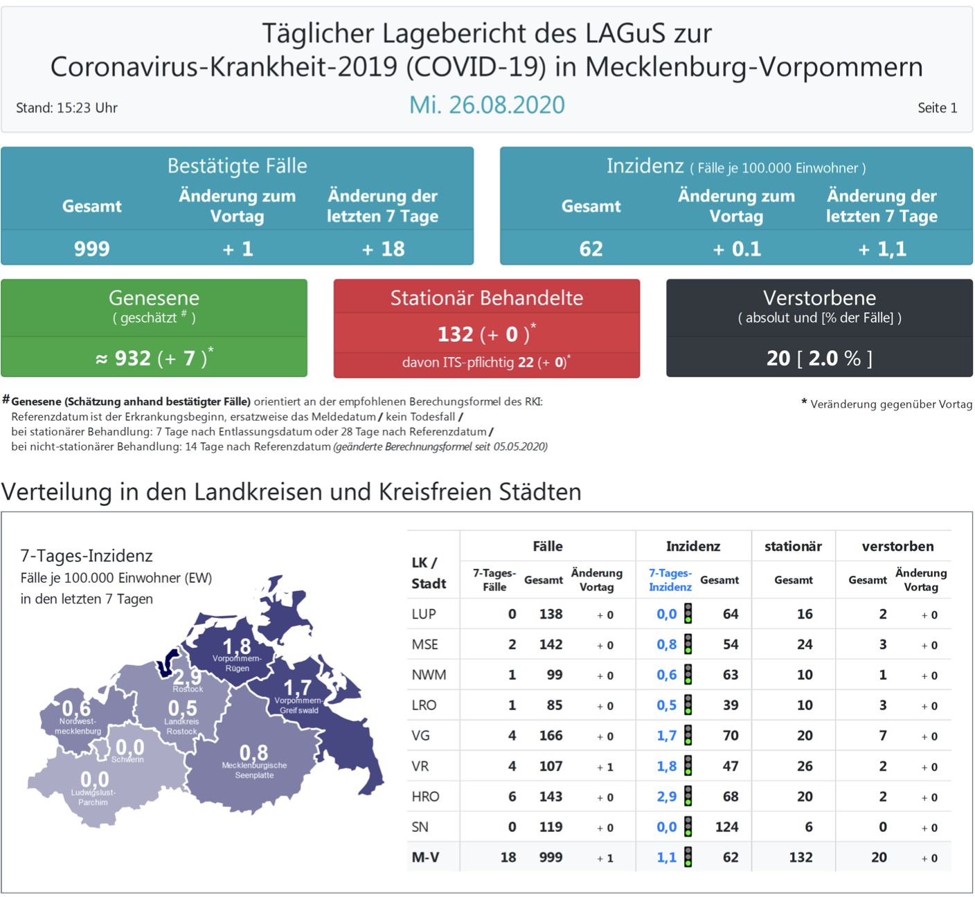 Landesweit müssen oder mussten den Angaben zufolge 132 (+0) Menschen in Kliniken behandelt werden, 22 (+0) von ihnen auf Intensivstationen.