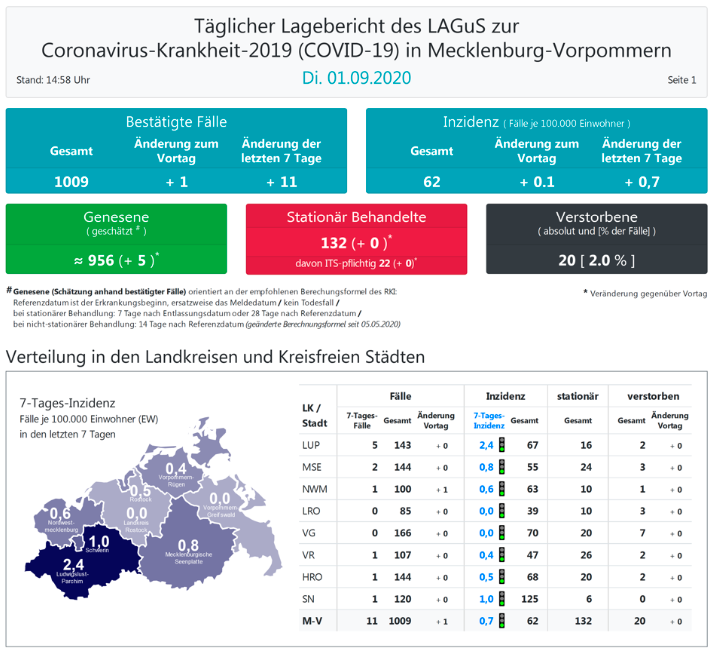 Laut einer Schätzung des Robert Koch-Instituts (RKI) sind in Mecklenburg-Vorpommern 956 (+5) der positiv getesteten Menschen von einer Covid-19-Erkrankung genesen. Insgesamt gab es bislang 20 Todesfälle im Land.