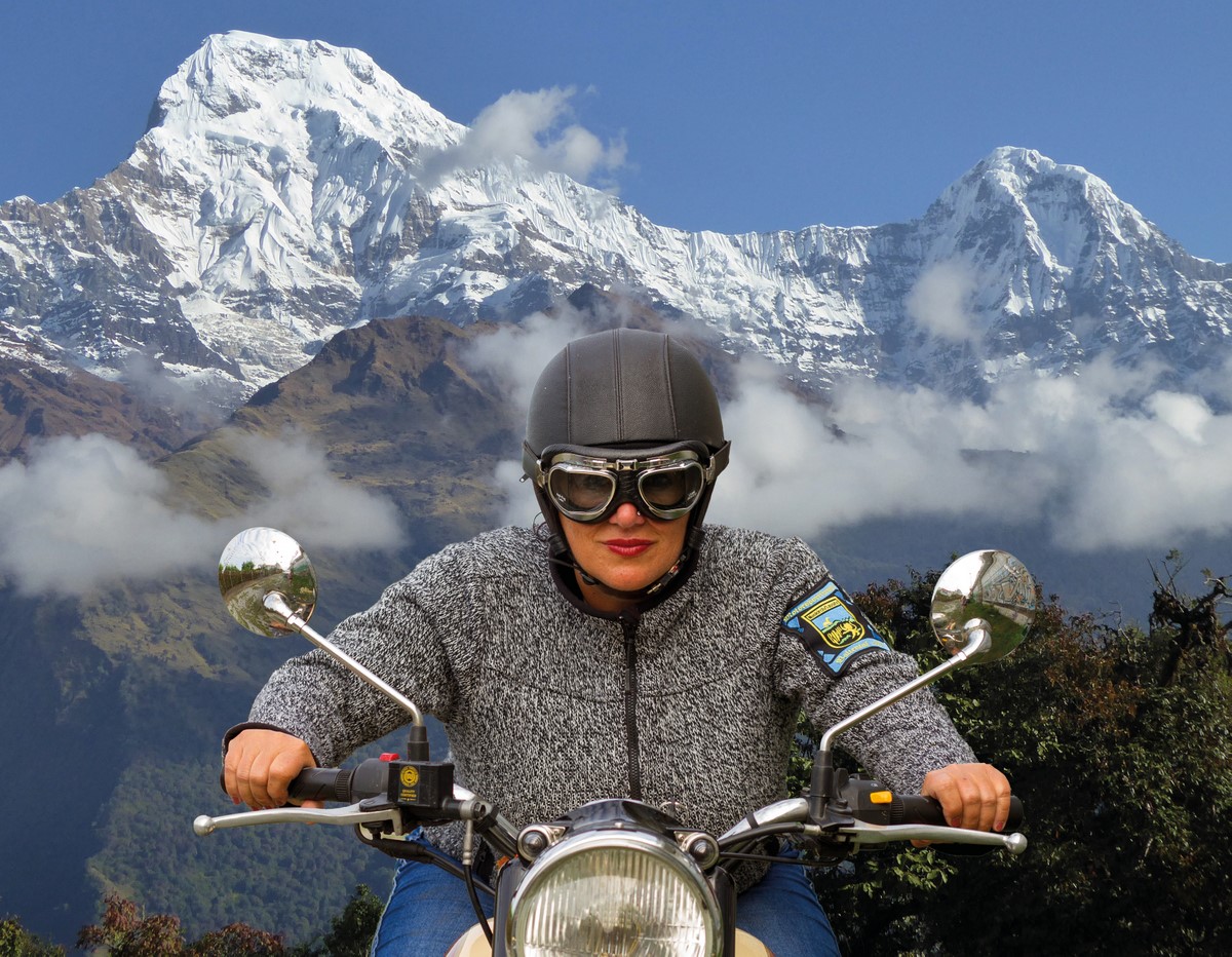 Ganz nach dem Motto ‚Man weiß ja nie…‘ erwarb Michaela Münzberg in ihrer Jugend den Motorrad-Führerschein und fuhr seitdem nie wieder. 30 Jahre später verliebte sie sich auf einer ihrer Nepal-Reisen in ein Motorrad – eine Royal Enfield – und lernte im chaotischen Stadtverkehr von Kathmandu und auf den Pisten der Umgebung das Fahren neu.