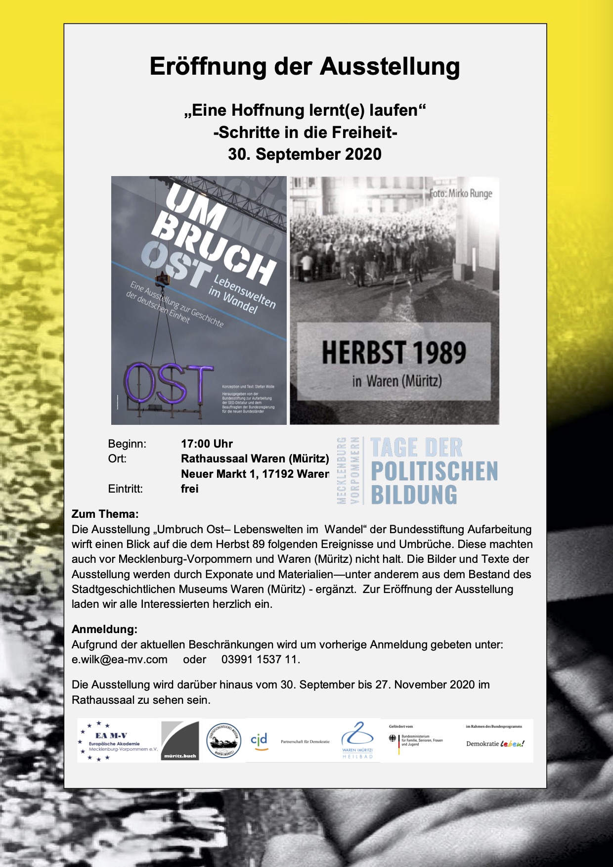 Zur Eröffnung der Ausstellung laden die Europäische Akademie Mecklenburg-Vorpommern und das Stadtgeschichtliche Museum Waren (Müritz) alle Interessierten ganz herzlich am 30. September ab 17 Uhr in den Rathaussaal Waren, Neuer Markt 1, ein.