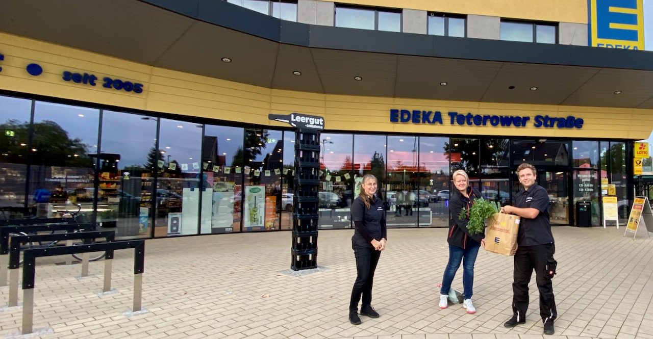 Foto oben: Christin Scudlo (Mitte) holt ihre Einkäufe im Markt in der Teterower Straße ab. Neben ihr die Chefin des Online-Shops „dein-edeka.de“, Elke Ewert, sowie ihr Stellvertreter Jonas Geistlinger.