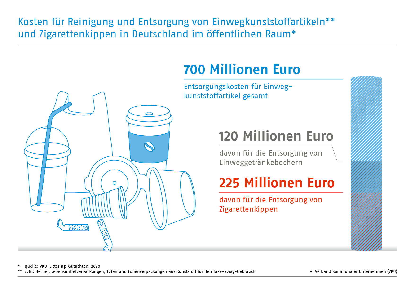 Die Städte und Gemeinden in Deutschland zahlen jährlich rund 700 Millionen Euro, um Parks und Straßen von Zigarettenkippen, To-Go-Bechern und anderen Einwegplastik-Produkten zu reinigen sowie öffentliche Abfallbehälter zu leeren und die Abfälle zu entsorgen. Davon entfallen allein auf die Entsorgung von Zigarettenkippen rund 225 Millionen Euro. Für die Entsorgung von To-go-Bechern aus Plastik fallen rund 120 Millionen Euro pro Jahr an. Das ist das Ergebnis einer Studie des Verbands kommunaler Unternehmen (VKU). Es handelt sich dabei um die erste Analyse, die repräsentative und aktuelle Zahlen zu den Reinigungs- und Entsorgungskosten der Kommunen zur Verfügung stellt und nach den unterschiedlichen Abfallarten aufschlüsselt.