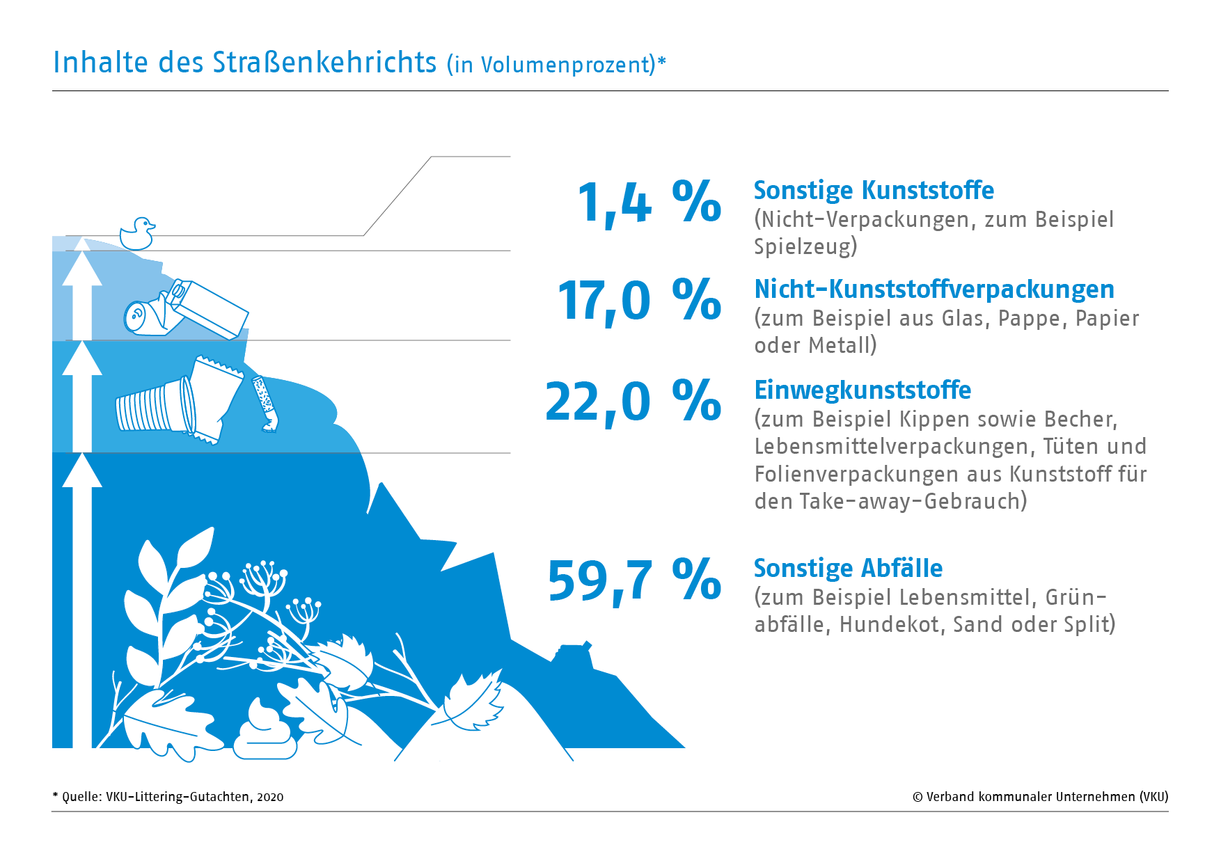 Pro Einwohner und Jahr entsorgen die kommunalen Stadtreiniger in Deutschland knapp 140 Liter Straßenmüll. Das ist die Menge, die in Straßenpapierkörben, auf der Straße oder im Gebüsch landet. Ein Großteil dieser Abfälle sind mit mehr als 40 Prozent Produkte aus Einwegplastik und Verpackungen. Knapp 50 Prozent des Volumens machen Grünabfälle, Straßensplit oder Sand aus. Das sind Abfälle, die umweltbedingt anfallen oder aus dem Winterdienst stammen und sich damit nicht vermeiden lassen.