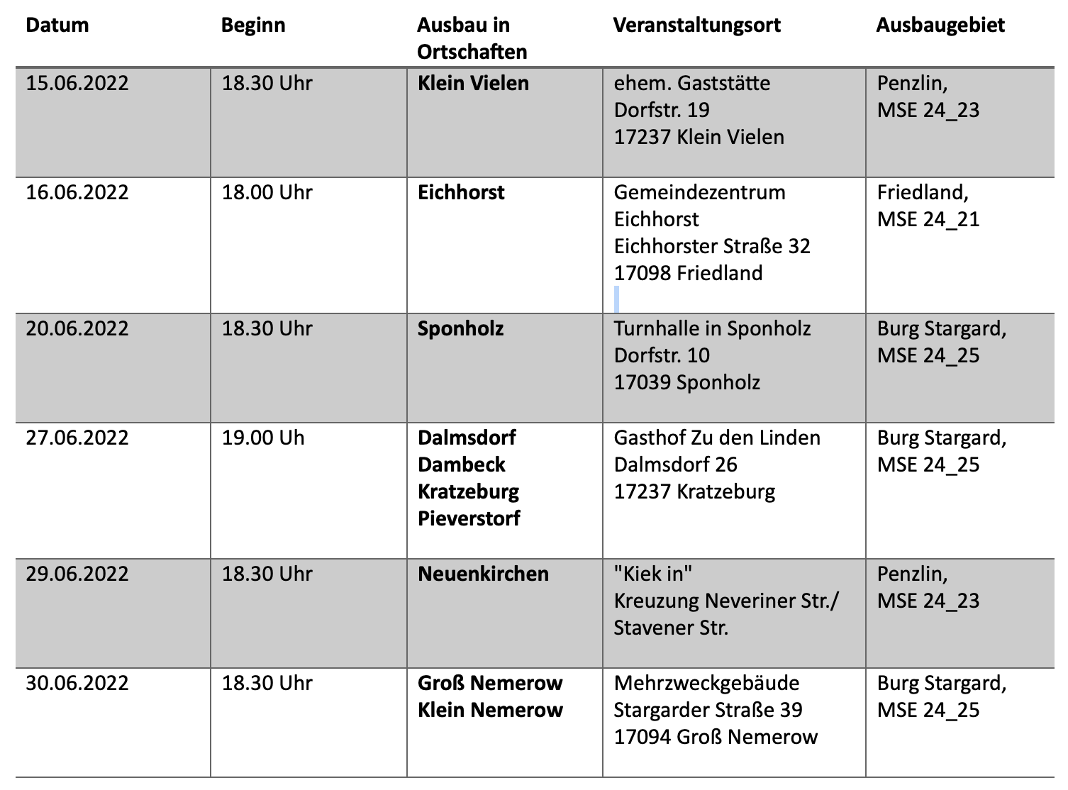 Die Neubrandenburger Stadtwerke informieren in weiteren Orten über den Breitbandausbau. Die Hausanschlüsse dafür sind kostenlos, denn der Ausbau wird von Bund und Land gefördert. Wie die Arbeiten laufen, wann es losgeht und wie die Förderung funktioniert, all das wird demnächst auf mehreren Einwohnerversammlungen erklärt.
