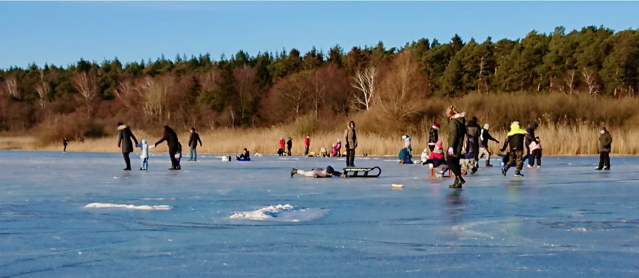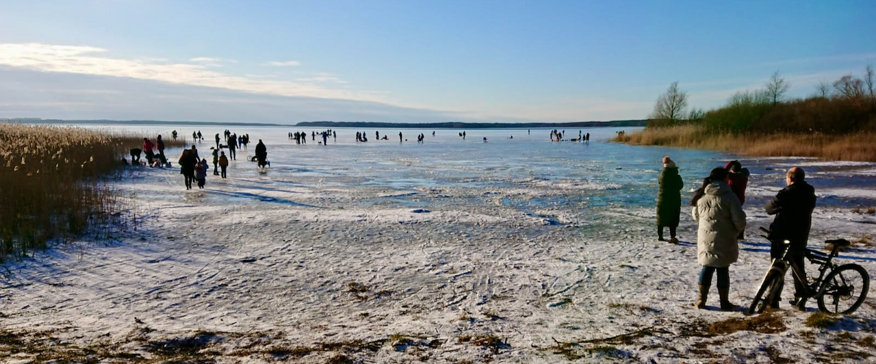Viele Lauflustige schlitterten immer parallel zum Ufer im Flachwasserbereich entlang. Andere schlitterten beim Nachhausefahren: Mit den Autos. Der Waldweg ist ebenfalls manchmal spiegelglatt, also Vorsicht, wer noch dort hin will. Ein paar Eisfreunde waren auch an der ebenfalls flachen Kuhtränke in Waren auf der Müritz unterwegs. Ein paar hundert Meter weiter saßen Wasservögel noch an großen Wasserlöchern, die Binnenmüritz ist noch nicht zugefroren.