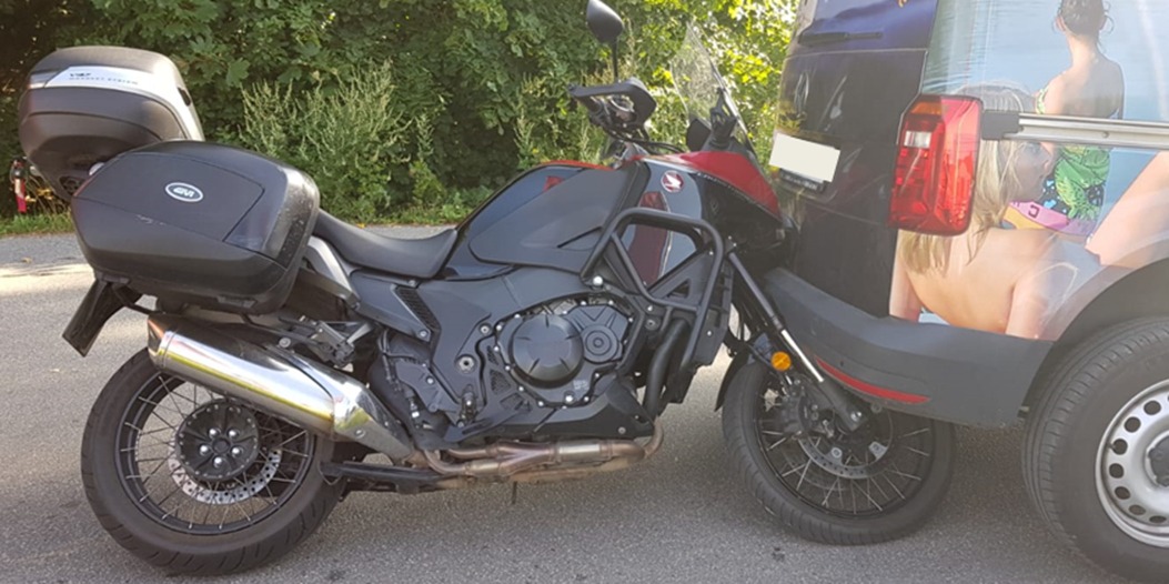 Wir beginnen mal gleich mit der guten Nachricht: Bei diesem Unfall wurde niemand verletzt! Passiert heute morgen in Eldenburg. Der Fahrer eines VW Caddy wollte von der Straße An der Reeck auf die Bundesstraße 192 abbiegen und stoppte im Einmündungsbereich. Hinter ihm hielt der Fahrer eines Krad Suzuki. Da sich auf dem querenden Radweg Fahrradfahrer näherten und der Pkw-Fahrer den Weg versperrte, setzte er zurück. Dabei übersah er den hinter ihm stehenden Fahrer des Krades. Der Caddy verkeilte sich auf dem Vorderrad des Motorrades. Der Kradfahrer blieb zum Glück unverletzt.
