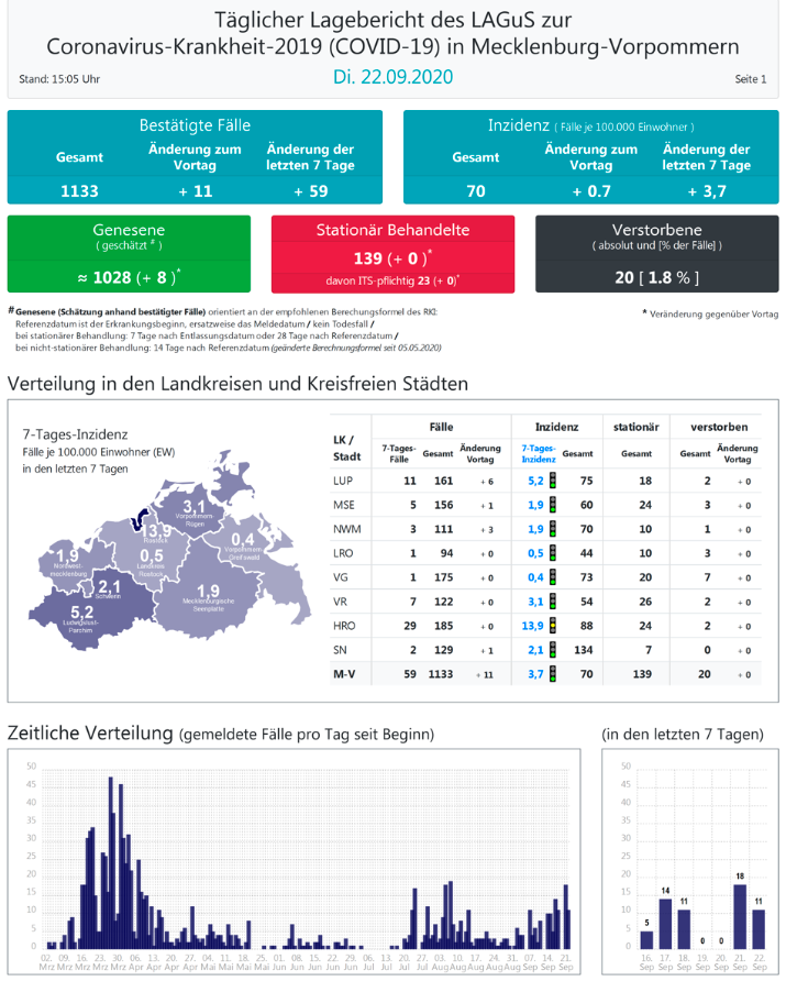 Landesweit müssen oder mussten den Angaben zufolge 139 Menschen in Kliniken behandelt werden, 22 (+0) von ihnen auf Intensivstationen.