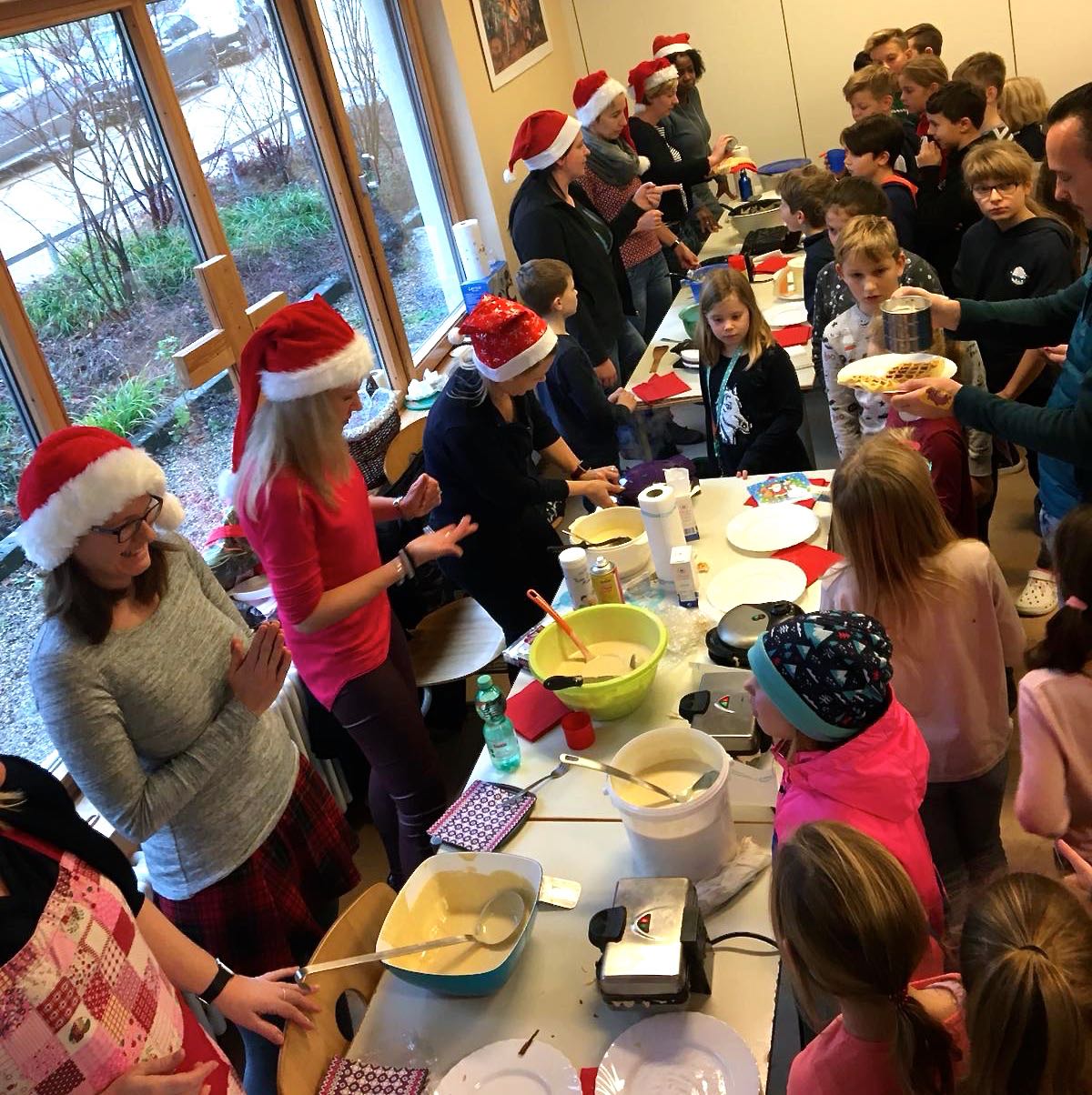 Vorweihnachtliche Überraschung gelungen! Die Kids der Warener Arche Schule wurden heute in der großen Pause von Eltern überrascht. Die haben – ausstaffiert mit Weihnachtsmützen – für sie frische, leckere Waffeln gebacken und damit genau den Geschmack der Mädchen und Jungen getroffen.