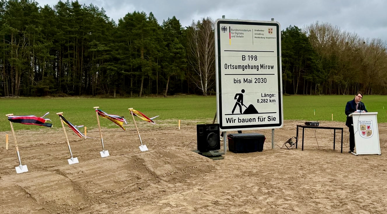 „Das ist ein besonderes Ereignis für die Stadt Mirow und die Region. Der Spatenstich zur Ortsumgehung Mirow markiert nicht nur den sichtbaren Start einer lang ersehnten Baumaßnahme. Der Bau der Ortsumgehung ist auch das Ergebnis langer Planung und des großen Engagements vieler Beteiligter – das ist ein ganz wichtiger Tag für Mirow und für viele, die hier heute sind. Mirow wird verkehrssicherer, zukunftssicherer und noch lebenswerter“, wo der Wirtschaftsminister.