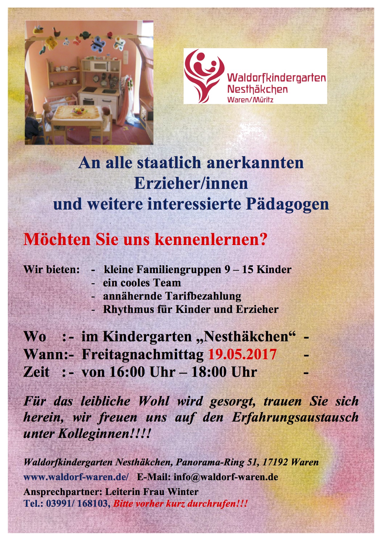 Mal ein anderer Weg, um mit eventuellen neuen Kollegen ins Gespräch zu kommen. Die Waldorfkita in Waren lädt am Freitag zu einem Tag der offenen Tür für interessierte Bewerber ein.
