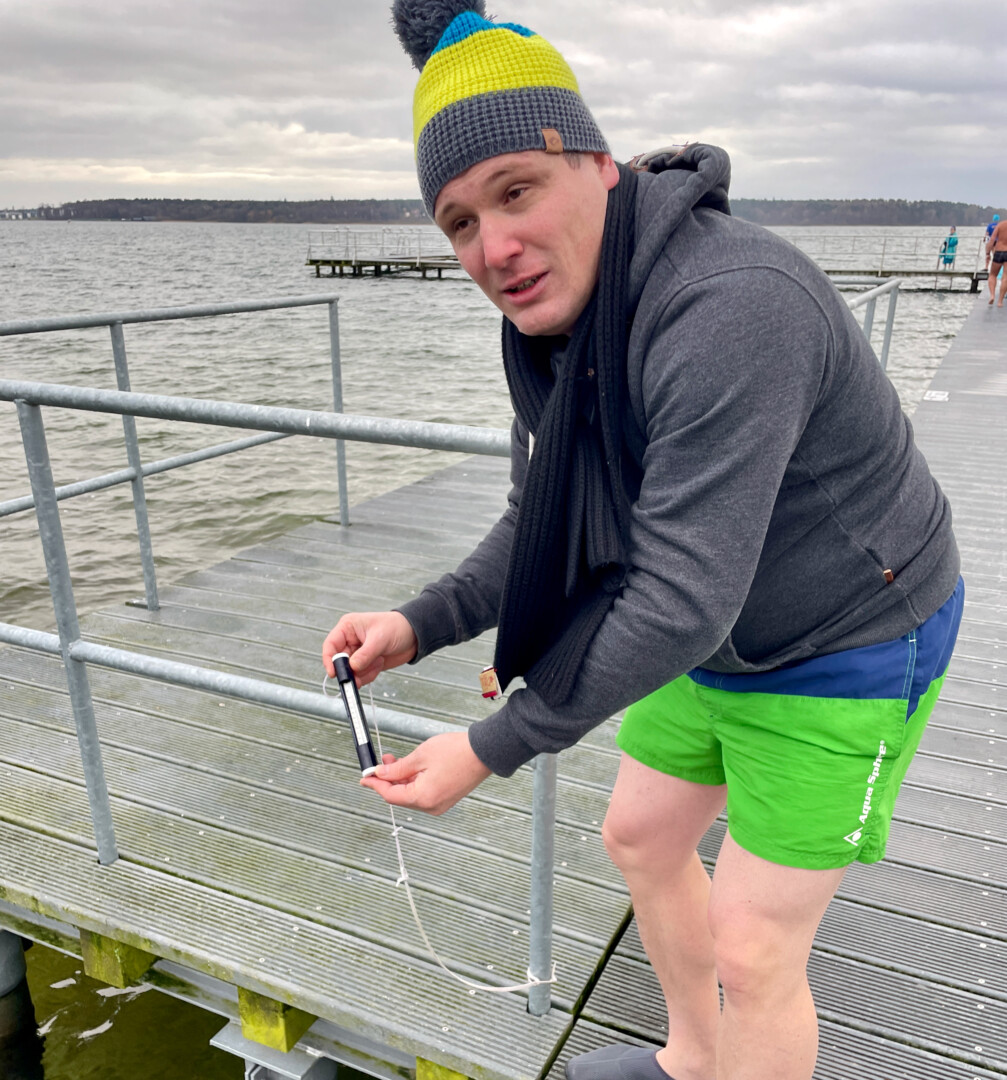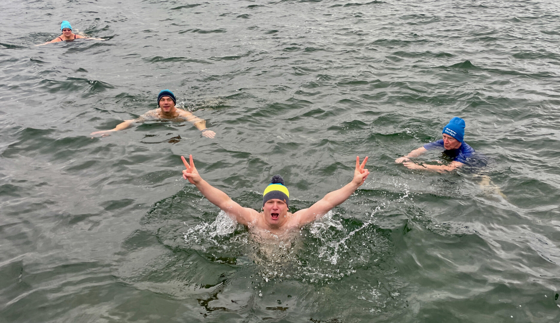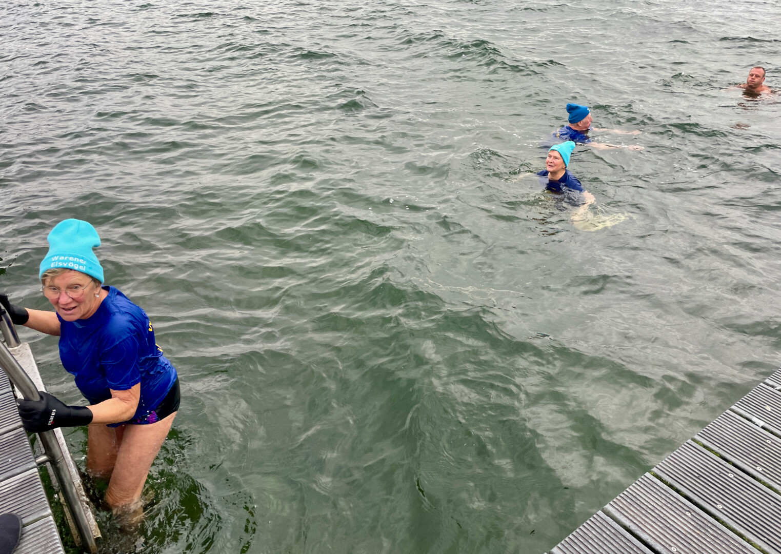 Hauptsache eine schön warme Mütze auf dem Kopf: Gut 20 Frauen und Männer und ein Kind haben heute Nachmittag am Warener Volksbad angebadet und das neue Jahr damit ziemlich erfrischend begrüßt. Während sich die Zuschauer in ihre Jacken eingemummelt hatten, drehten sie in der gut vier Grad kalten Müritz einige Runde.