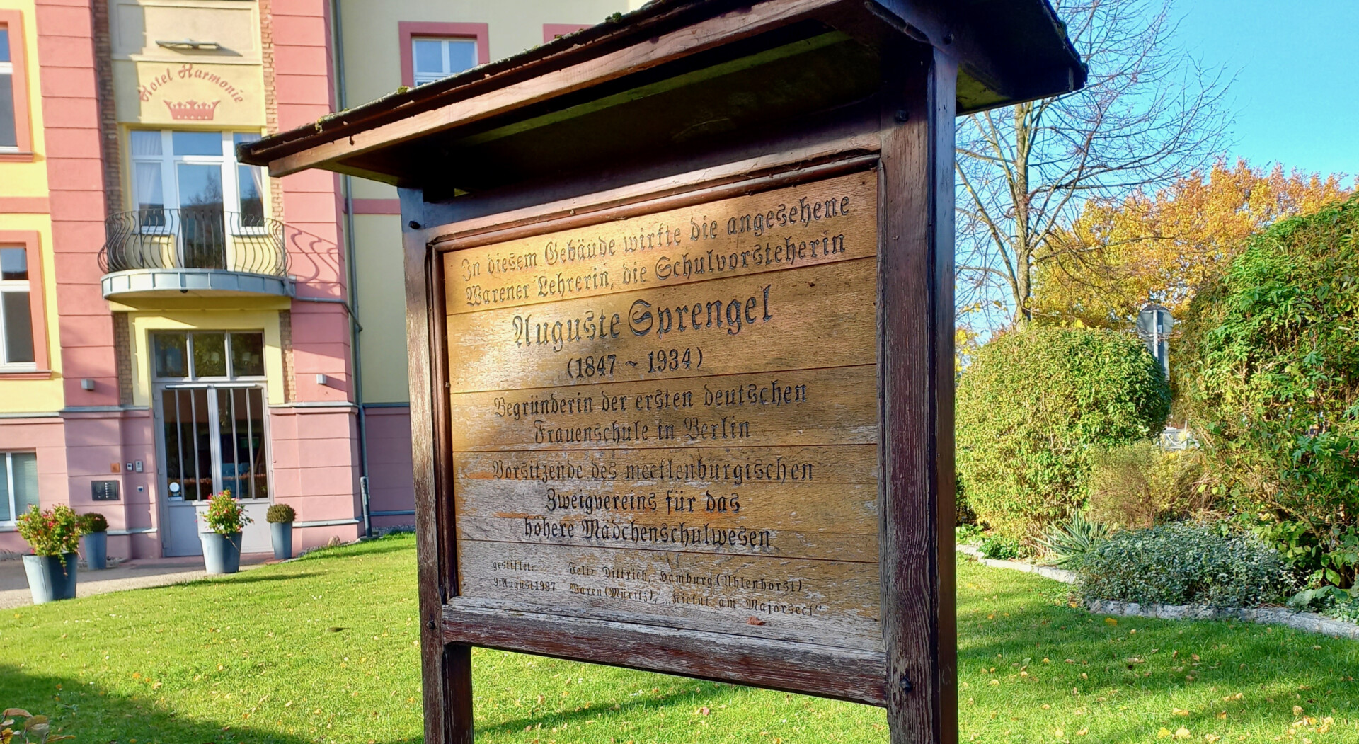 Vor fast genau 26 Jahren stiftete Felix Dittrich eine hölzerne Gedenktafel am heutigen „Hotel Harmonie“, der ehemaligen Auguste-Sprengel-Schule. Es sollte an die damalige Wirkungsstätte von Auguste Sprengel erinnern. Denn die hat viel für Waren getan. Doch der Zahn der Zeit nagte an diesem Schild, zuletzt war selbst die Standsicherheit nicht mehr gegeben. Die Warener Stadtführer um Petra Hakert wollten diesen Zustand nicht einfach so hinnehmen und machten sich stark.