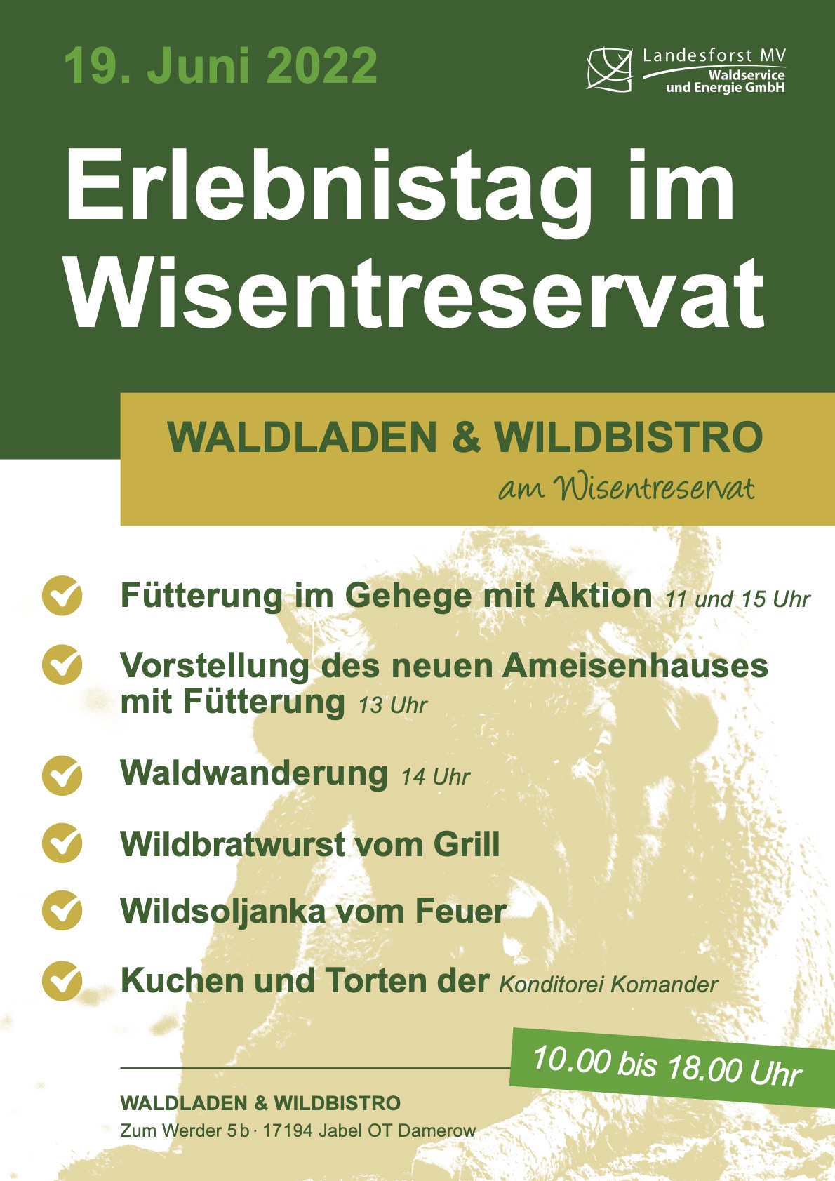 Im Wisentreservat Damerow ist heute von 10 bis 18 Uhr wieder einiges los. Die Besucher können den Wisenten bei den Fütterungen ganz nah kommen, die Mitarbeiter stellen das neue Ameisenhaus vor, um 14 Uhr beginnt eine Waldwanderung, und natürlich gibt’s wie immer „wilde Gerichte“. Unter anderem eine Wildsoljanka. Auch eine Hüpfburg steht bereit.