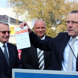 Es ist vollbracht: Genau vier Jahre, nachdem Jost Reinhold zwei Millionen Euro für ein Jugendzentrum in Waren gespendet hat, konnte der 85-Jährige heute gemeinsam mit Bürgermeister Norbert Möller und Stadtpräsident René Drühl den ersten Spatenstich für das „JOO!“ machen.