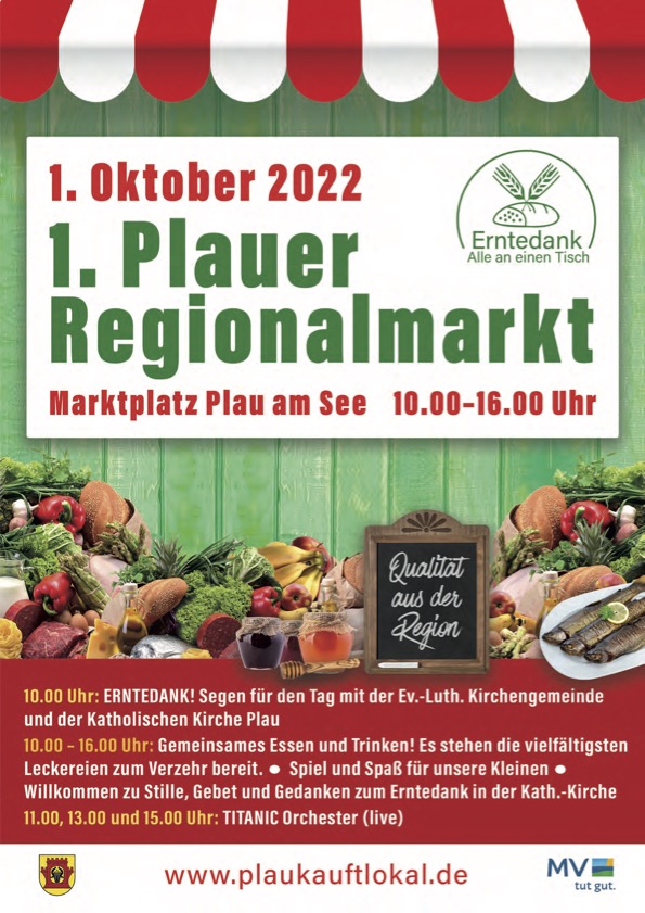 Für die Unterhaltung der Großen sorgt um 11 um 13 und um 15 Uhr wieder das „Titanic Orchester“. Um 10 Uhr eröffnen die Evangelisch-Lutherische Kirchengemeinde und die Katholische Kirche Plau mit einer gemeinschaftlichen Andacht das Markttreiben und stellen diesen Tag unter den Segen Gottes. Die katholische Kirche lädt zudem zu Stille, Gebet und Gedanken zum Erntedank in der Kirche, Markt 13 ein.