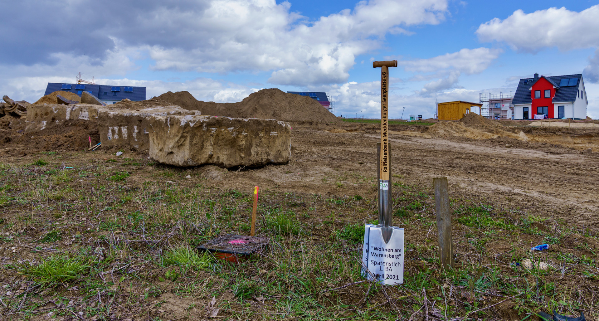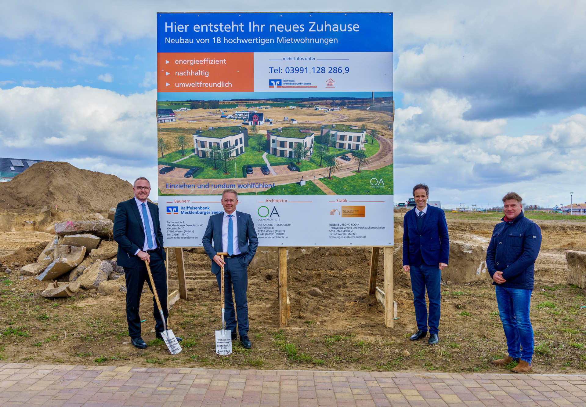plant dort den Bau von drei modernen Mehrfamilienhäusern mit insgesamt 18 Mietwohnungen. Vor wenigen Tagen gab’s im kleinen Kreis den symbolischen ersten Spatenstich. „Die Erdarbeiten haben bereits in der Vorwoche begonnen, um den ambitionierten Fertigstellungsplan auch einzuhalten“, so Bank-Vorstand Jens Mandelkow. Der Bau befindet sich bereits seit April letzten Jahres in der Planung. Zunächst wurde in einem Planungswettbewerb nach dem bestmöglichen Partner Ausschau gehalten. Mit einer sehr attraktiven Architektur sowie einem umweltfreundlichen und energiesparenden Baukonzept konnten die Warener Planungsbüros Ocean Architekts und Ingenieurbüro Rodin am Ende für sich überzeugen.
