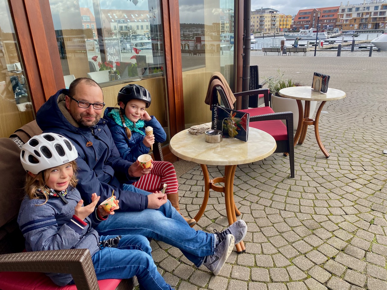 Der Frühling lässt grüßen – am Warener Hafen stehen die ersten Tische und Bänke im Freien und sie werden auch ausgiebig genutzt. „Eis geht immer“, meinte dieser Papa und hat mit seinen Kindern das erste Eis der Saison vor der Tür genossen.