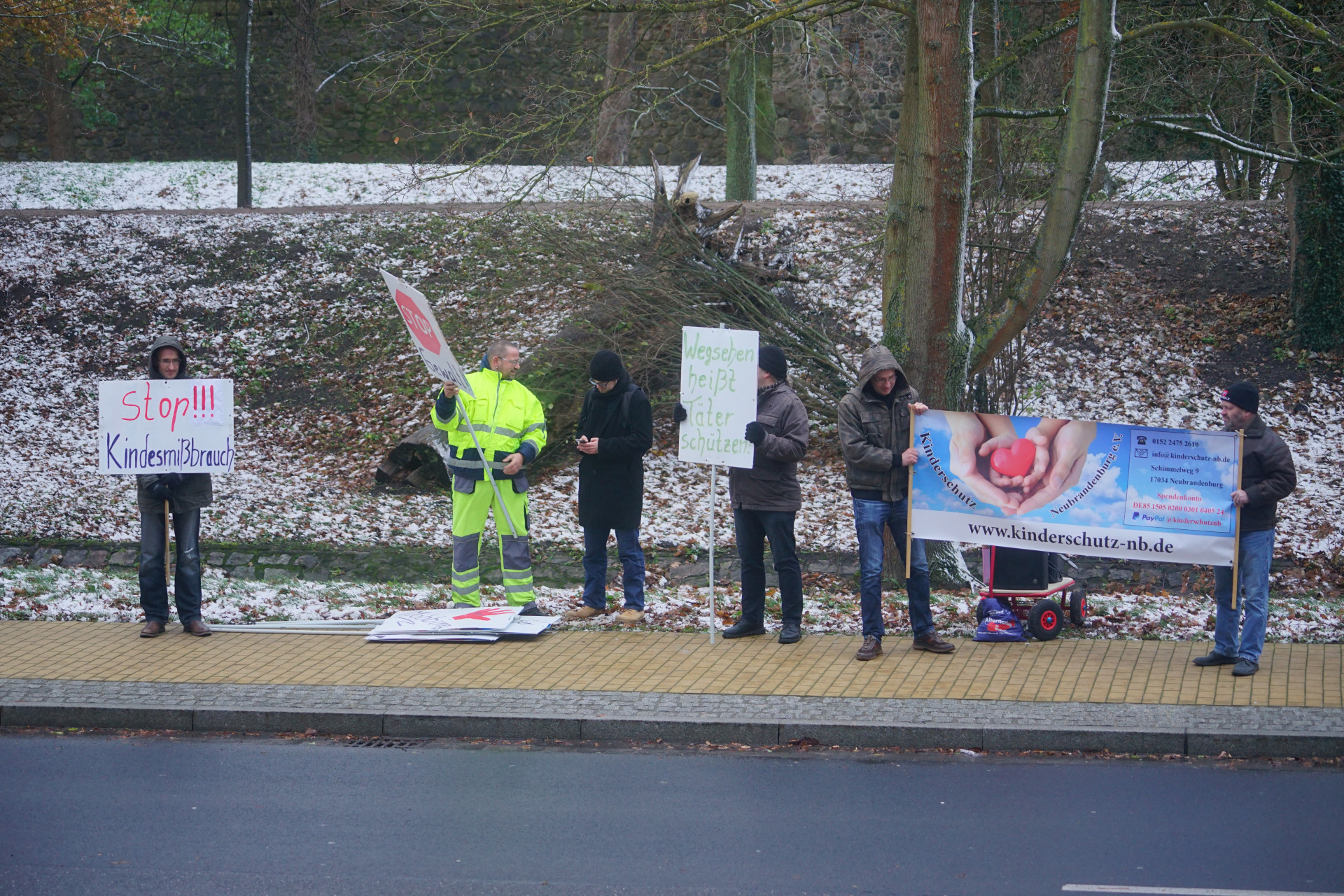 Mit im Gerichtssaal auch Leonies leiblicher Vater Oliver Ehmke, der als Nebenkläger schon im Prozess gegen den verurteilten Stiefvater seiner Tochter dabei war und erneut als Nebenkläger auftritt. Vor dem Gericht demonstrierte ein neuer Kinderschutzverein aus Neubrandenburg gegen Gewalt an Kindern.