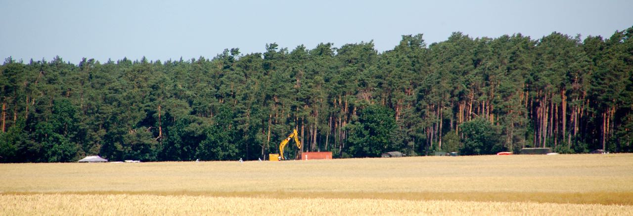 Bei Nossentiner Hütte war schon gestern in Sachen Beräumung ordentlich was los. Von der Straße nach Sparow aus konnte man beobachten, wie vor dem Waldsaum ein schwerer Kran immer wieder verkohlte Teile der einen abgestürzten Maschine „am Haken“ hatte. Der Kran hob die verkohlten Reste der Maschine nach und nach in einen Container.