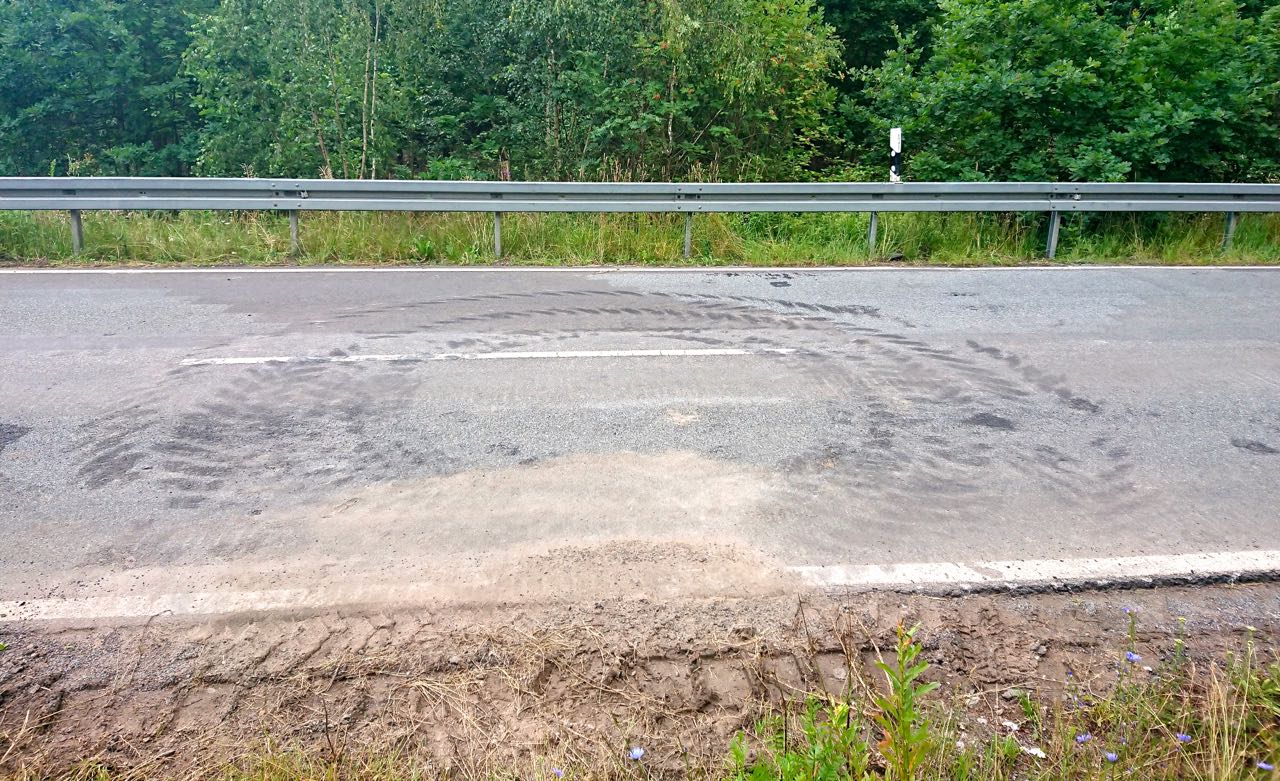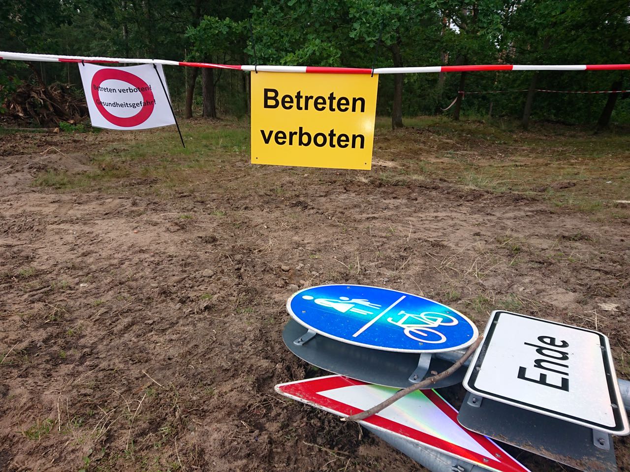 Gestern Vormittag: Während Bundeswehrsoldaten an der rot-weißen Absperrung basteln, haben sich Polizei und Straßenbauamt die Straße genau angesehen. Dabei sind einige verunreinigten Stellen erkennbar, Riefen von schweren Geräten und abgebrochene Leitpfosten. Eine Reinigung könnte sicherheitshalber ganz gut sein. „Betreten verboten – Gesundheitsgefahr“ steht auf rot-weißen Schildern am Warnband. Ungeachtet der noch stehenden Absperrungen fahren aber schon immer wieder Autos und Kleintransporter vorbei, sogar der Schienenersatzverkehr-Bus fährt schon zwischen Jabel und Silz.
