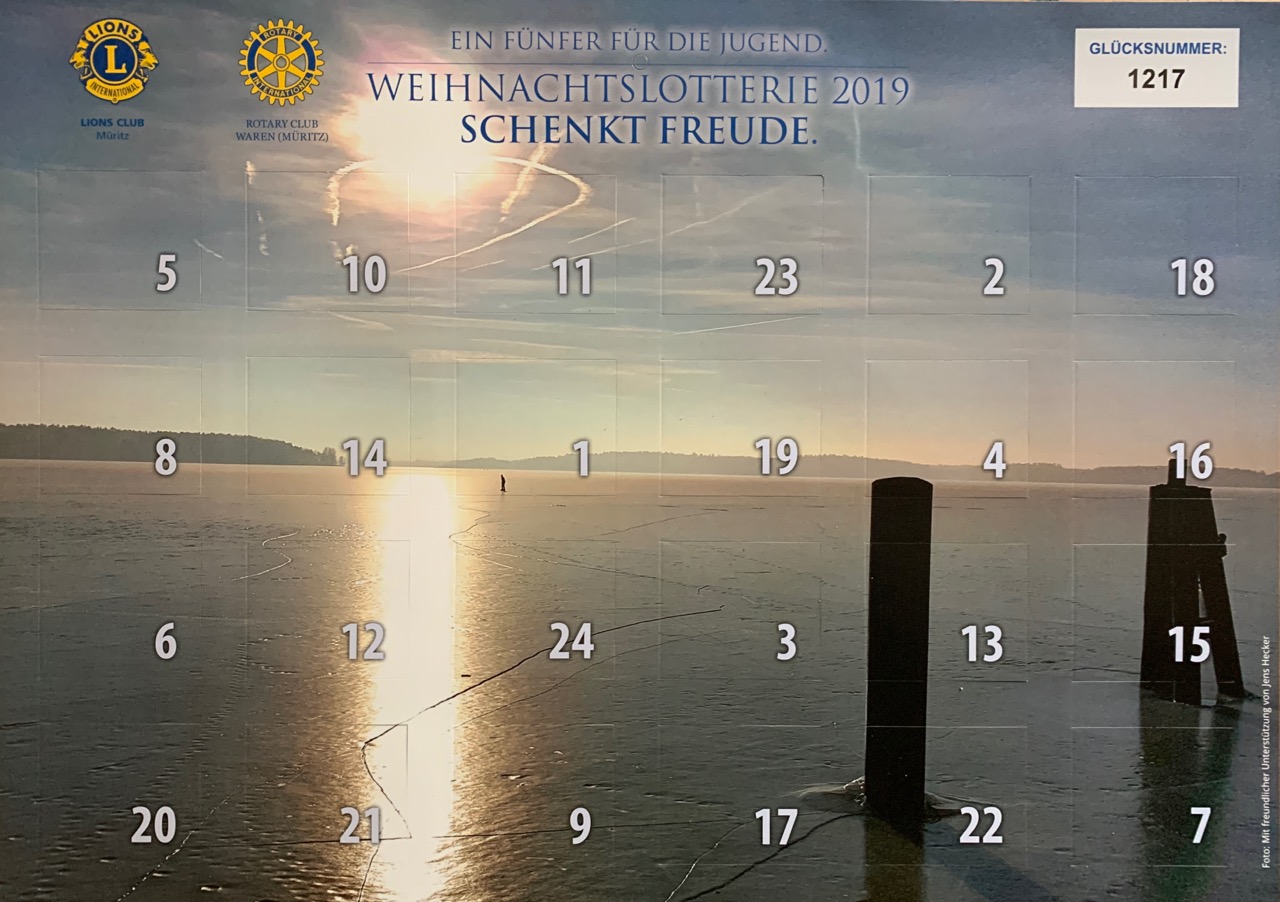 Bei „Wir sind Müritzer“ haben Sie die allerletzte Chance, noch einen der begehrten Kalender der Weihnachtslotterie des Lionsclub Müritz und des Rotaryclubs Waren zu erhalten.Wir verlosen exclusiv 30 der begehrten Kalender, die es nirgends mehr zu kaufen gibt, denn bis auf diese 30 Kalender wurden alle 8000 Exemplare bereits verkauft.