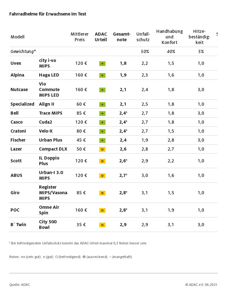 Im ADAC Test von 14 Fahrradhelmen für Erwachsene zwischen 160 und 35 Euro schnitten alle Modelle gut oder befriedigend ab. Die Helme im Urban- und City-Design wurden in den Kategorien Unfallschutz, Handhabung und Komfort sowie Hitzebeständigkeit und Schadstoffgehalt untersucht. Testsieger mit einer Gesamtnote von 1,8 ist der Uvex City i-vo MIPS. Mit die beste Handhabung und der zweitbeste Unfallschutz machen ihn bei einem Preis von 120 Euro zu einem echten Allrounder. Den besten Unfallschutz konnte sich der Urban Plus von Fischer sichern, mit nur 45 Euro einer der günstigsten Helme im Test.