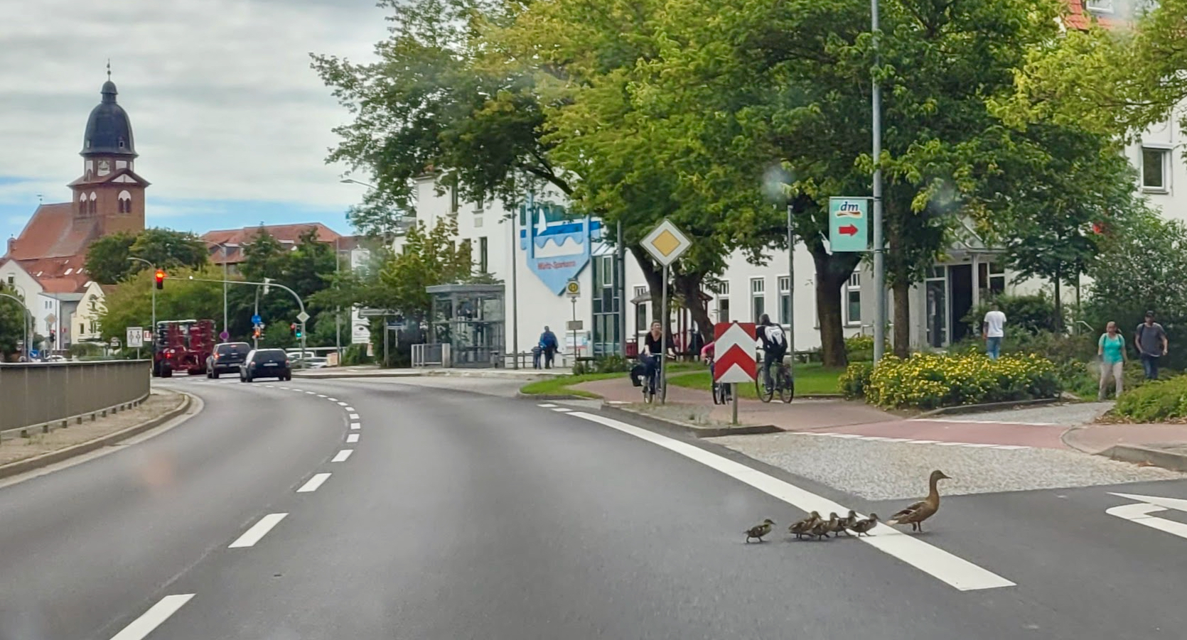Familienausflug in Waren! Und wenn sie unterwegs sind, haben sie auch Vorfahrt – selbst auf dem vielbefahrenen Schweriner Damm heute Mittag.