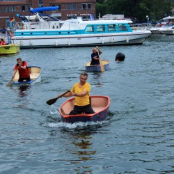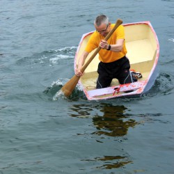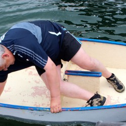 Viel Spaß heute beim Prominenten-Opti-Paddeln am Sail-Hafen: Obwohl niemand baden ging, stiegen einige Teilnehmer doch ziemlich durchgeweicht aus den Booten. Vor allem Bürgermeister Norbert Möller. Der hatte so viel Wasser in seinem Kahn, dass er einem Untergang nur knapp entging.