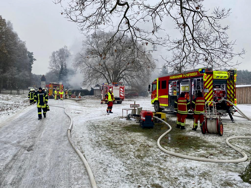 Schnell bauten die Einsatzkräfte eine lange Wegestrecke auf. In der Ortschaft standen ihnen ein Löschbrunnen sowie ein Löschteich zur Verfügung. Trotz des schnellen Löscheinsatzes konnten sie aber den Totalverlust des Hauses nicht mehr verhindern. Meterhoch schossen die Flammen aus dem Gebäude und fraßen sich am Ende bis ins Erdgeschoß des Hauses. Lediglich einen weiteren Anbau konnten die Kamerad retten.