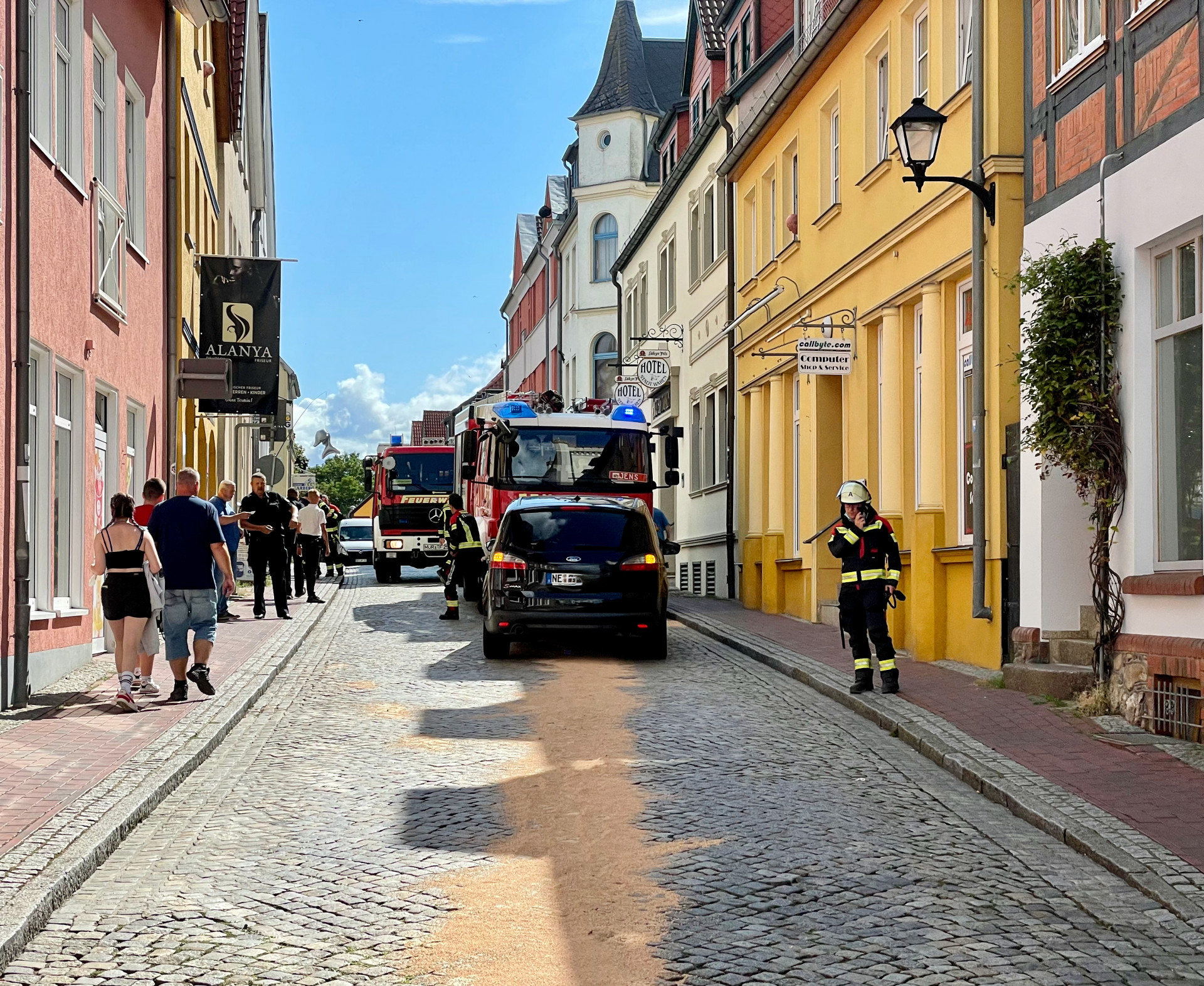 Das wiederum zog einen Einsatz der Warener Feuerwehr nach sich, denn der Poller beschädigte den Wagen, eine lange Ölspur zog sich vom Rathaus durch die Burgstraße