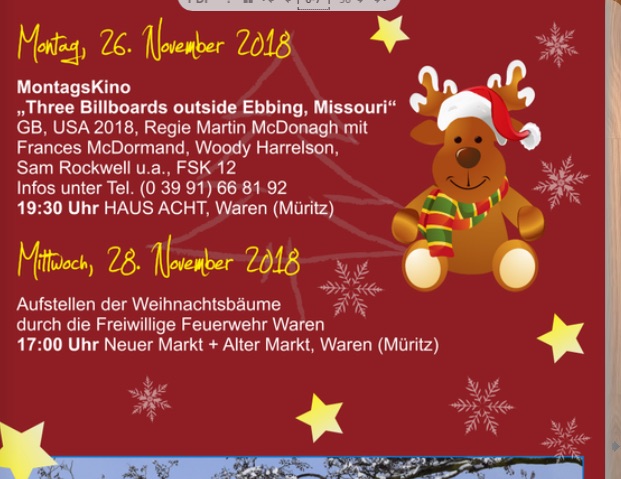 Diese Meldung, veröffentlicht in der Warener Weihnachtsbroschüre, hat heute für mächtig Wirbel gesorgt. Denn da steht, dass Warens Feuerwehrleute heute Abend die Weihnachtsbäume aufstellen.