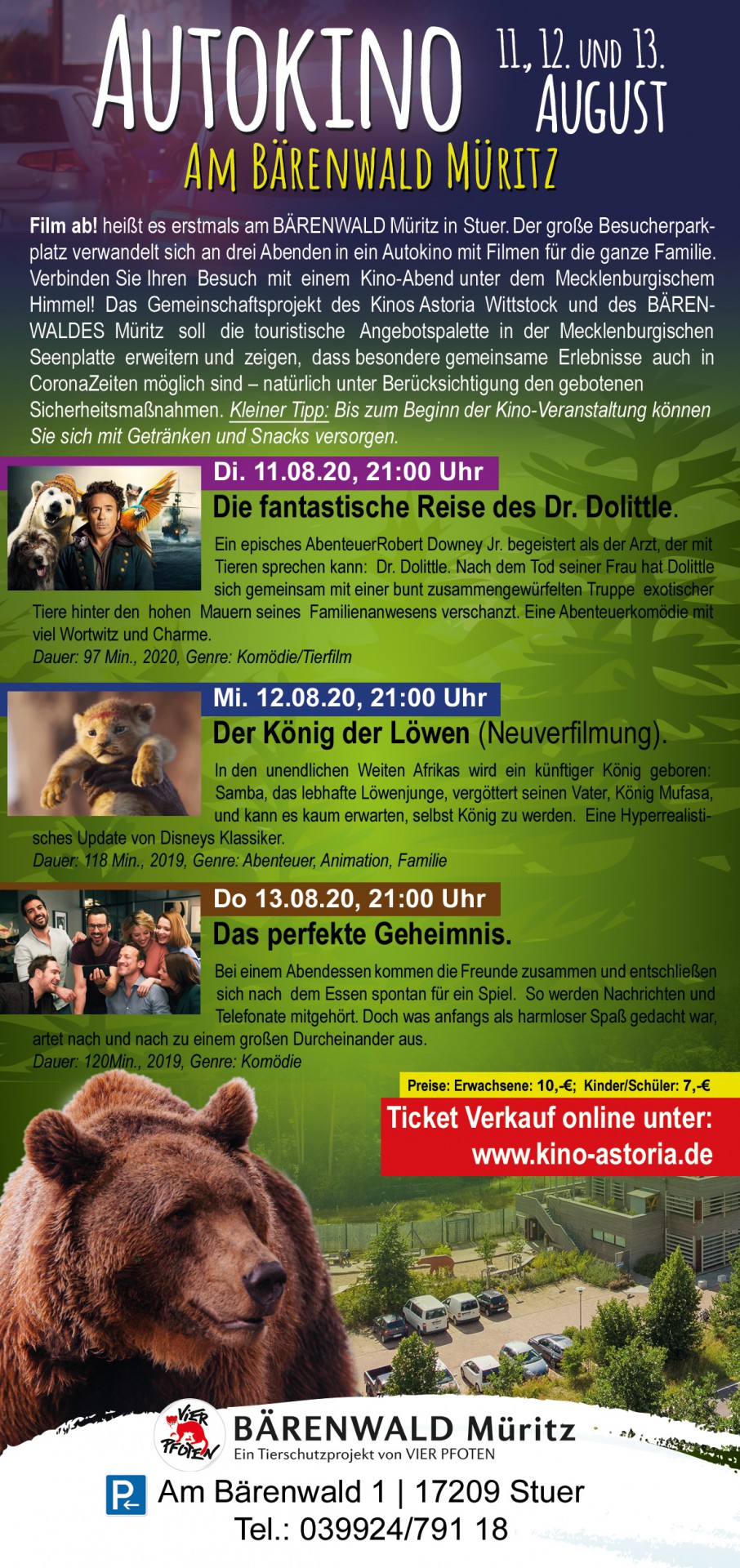 Film ab! heißt es erstmals am BÄRENWALD Müritz in Stuer. Der große Besucherparkplatz gegenüber der Tierschutzeinrichtung wird sich an drei Abenden im August in ein Autokino verwandeln. Das Gemeinschaftsprojekt des Kino Astoria Wittstock und des BÄRENWALDES Müritz soll die touristische Angebotspalette in der Mecklenburgischen Seenplatte bereichern und zeigen, dass besondere gemeinsame Erlebnisse auch in Corona-Zeiten möglich sind – natürlich unter Beachtung der notwendigen Sicherheitsstandards.